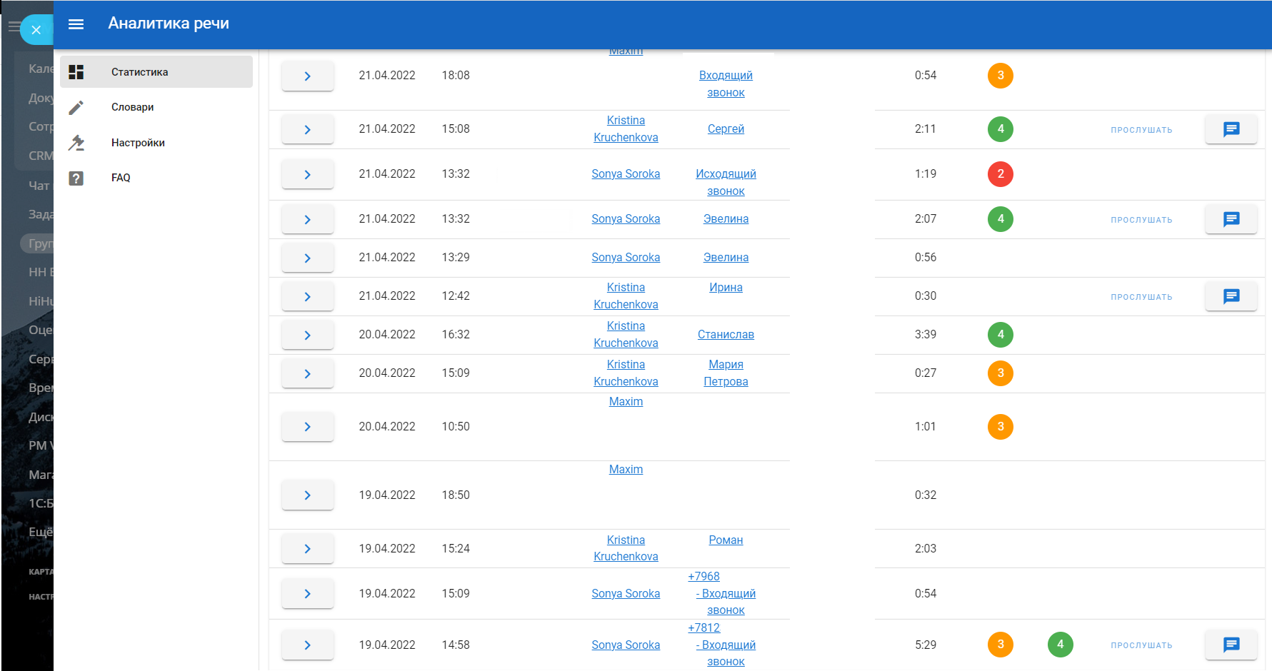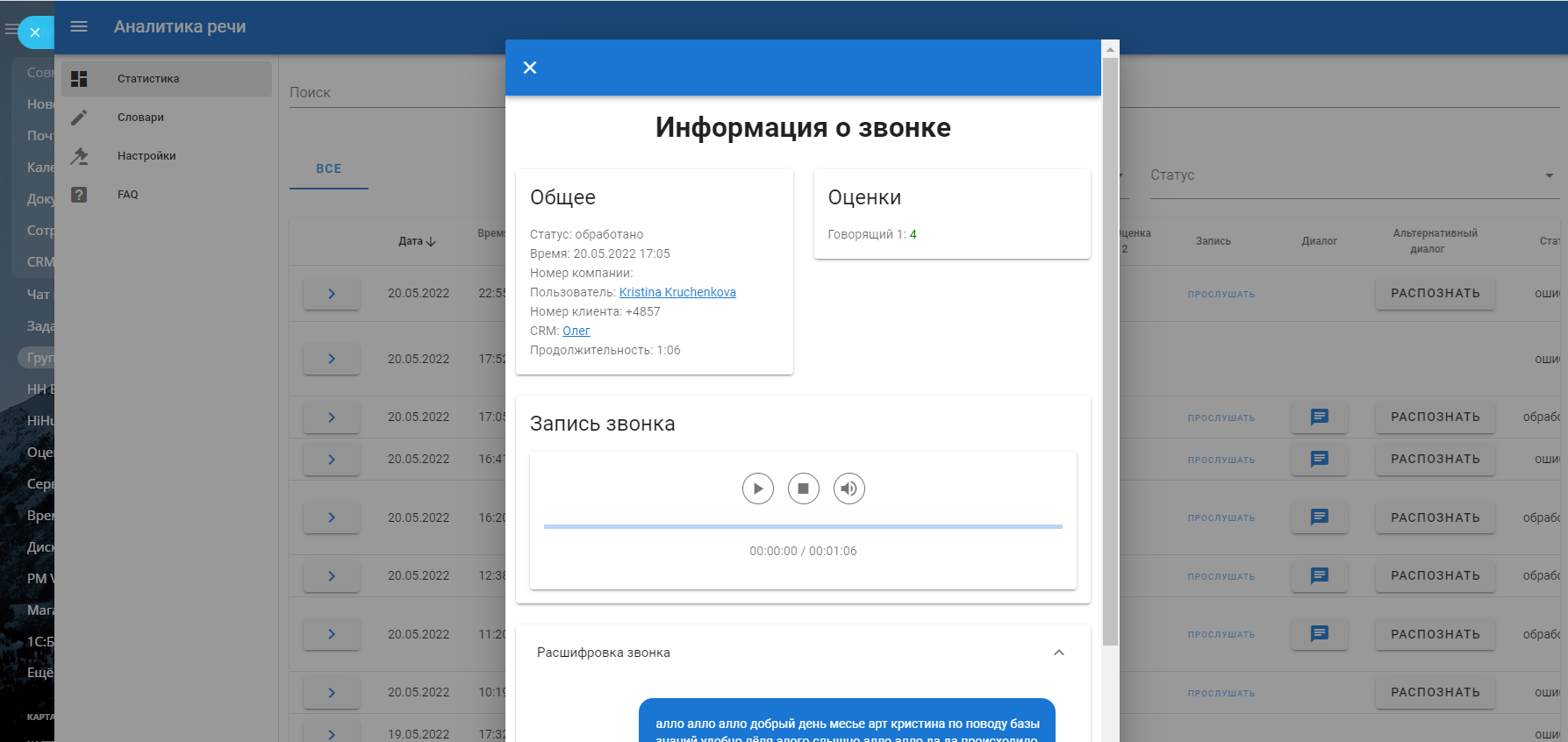 Сохраняя записи телефонных звонков на Битрикс24, вы можете их прослушивать, а также получать расшифровки звонков, созданные нейронной сетью. Текст разговоров вы можете увидеть как в карточке клиента в CRM-системе, так и в самом приложении речевой аналитики.