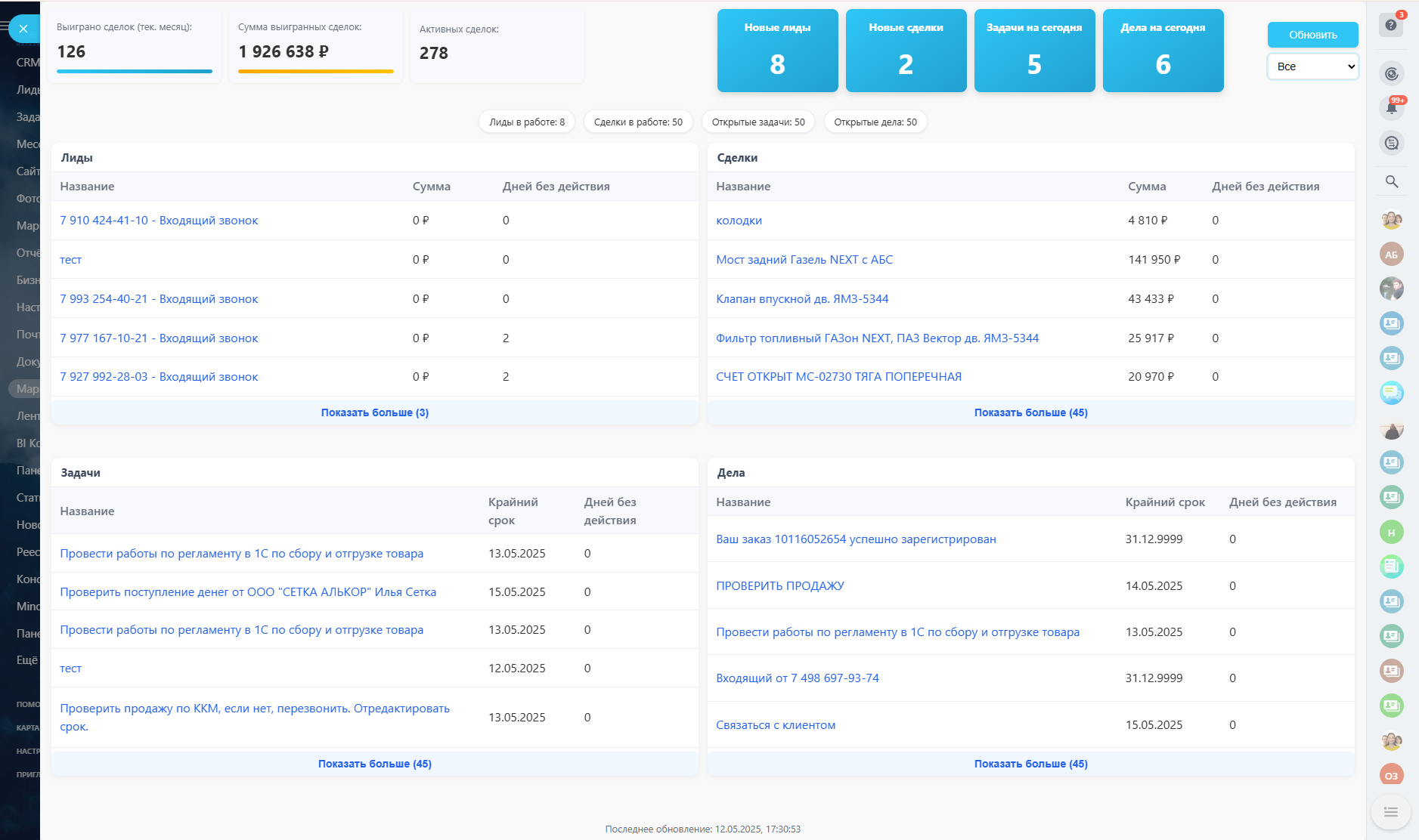 Панель менеджера: лиды, сделки, задачи, дела