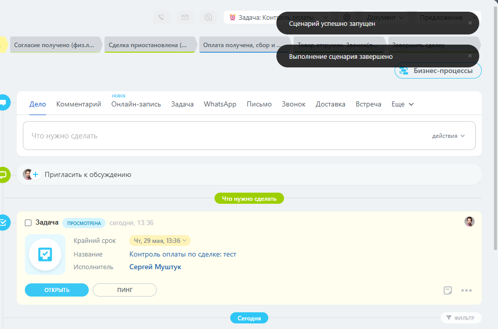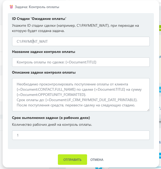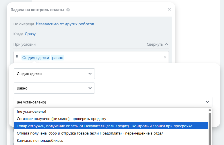 Задача на контроль поступления оплаты при переходе на стадию "Ожидание оплаты".