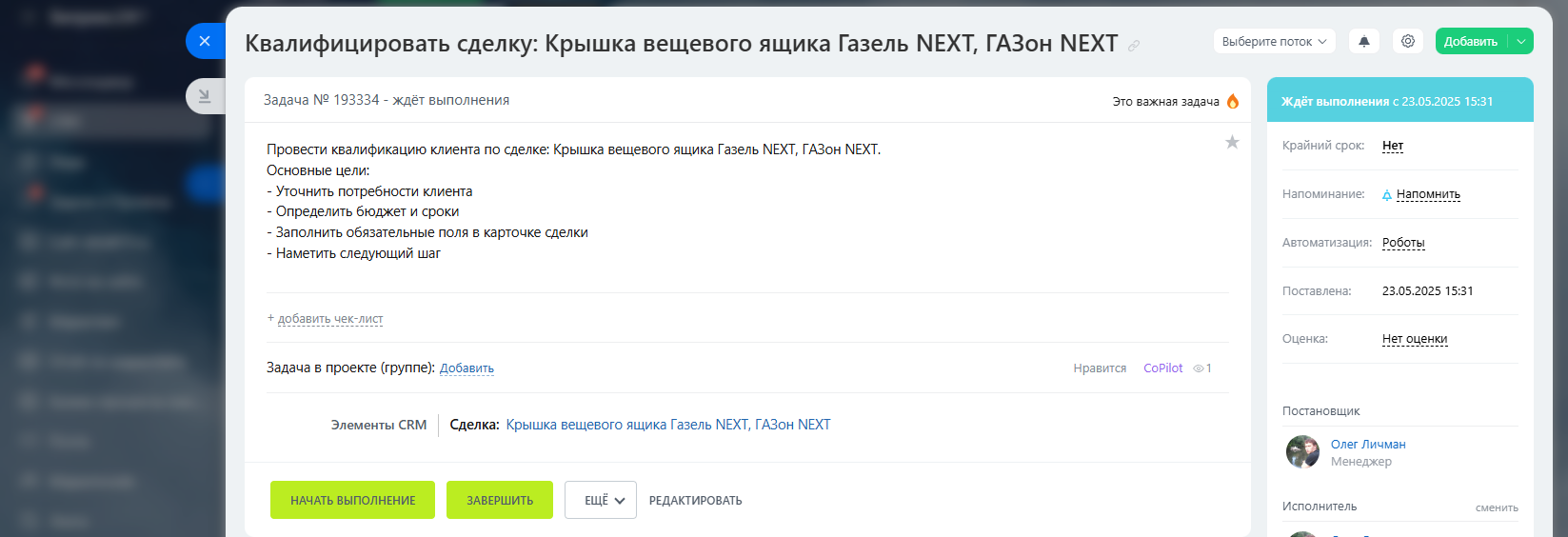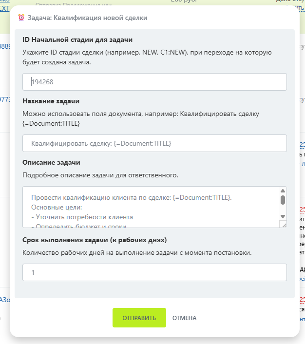 Автоматическая постановка задачи на квалификацию при создании или переходе сделки на начальную стадию.