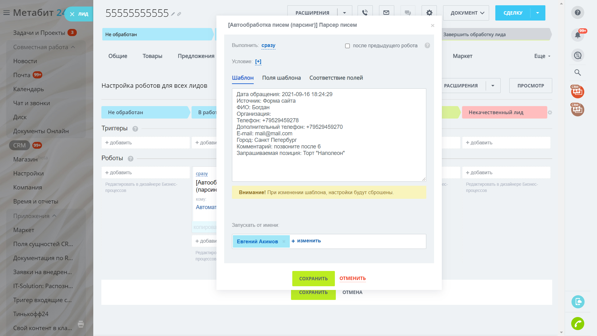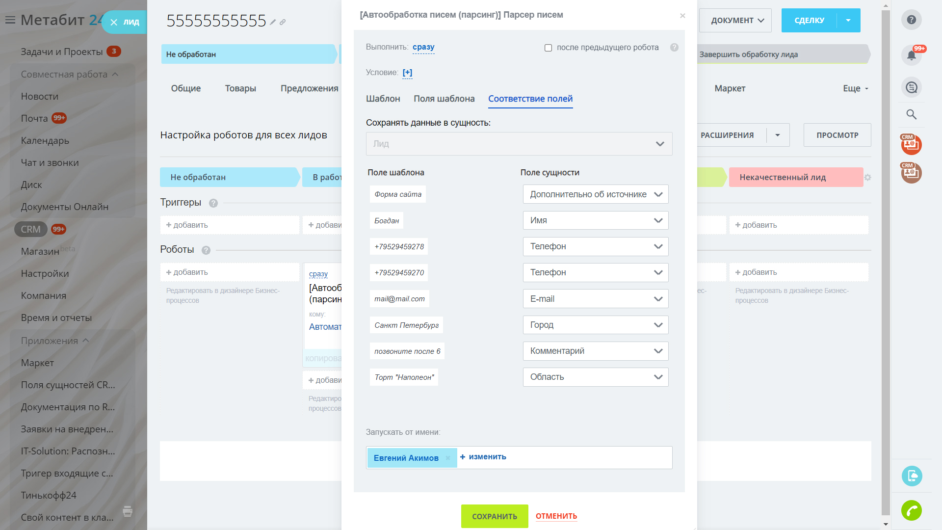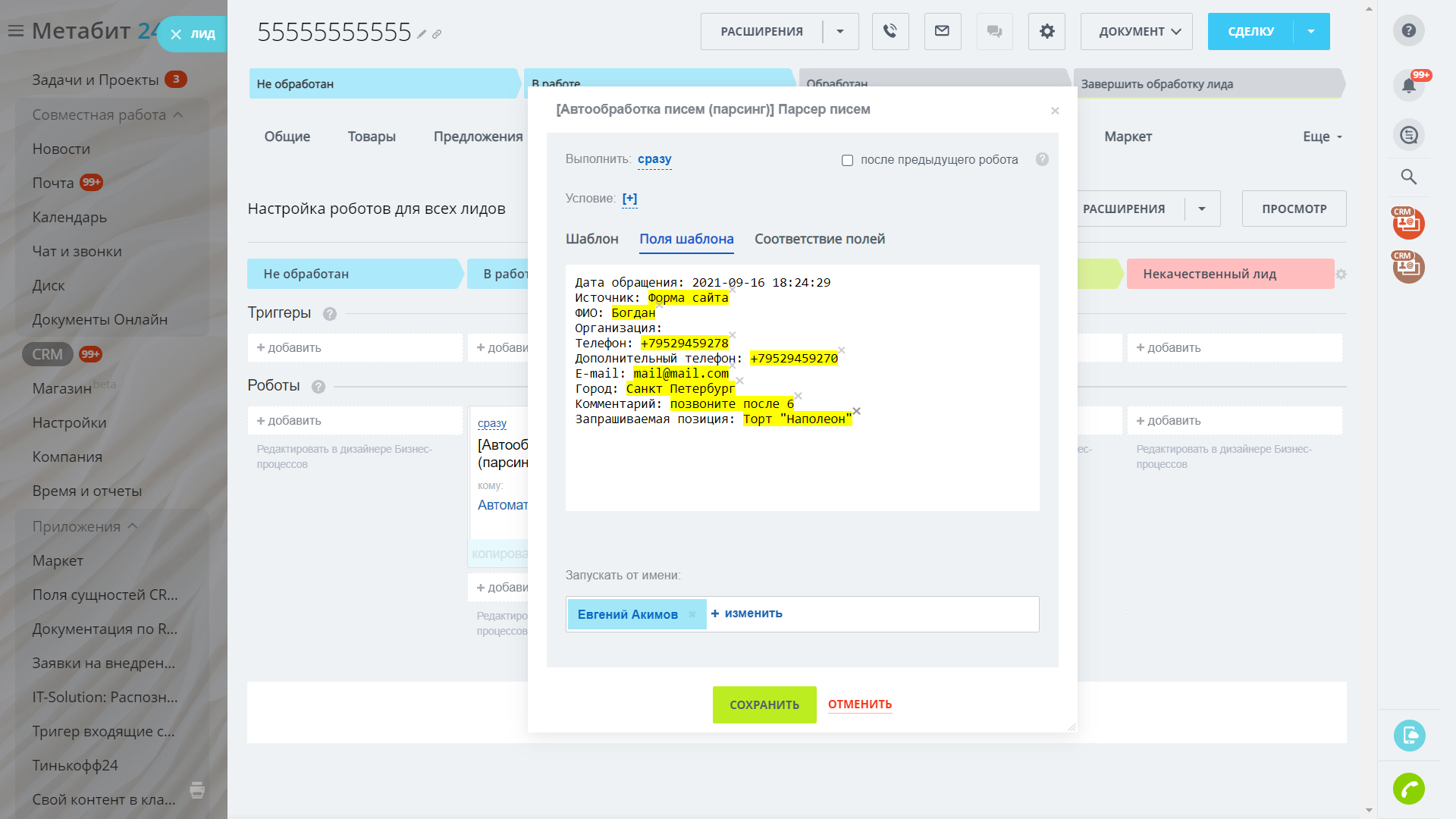 Если на почту присылаются типовые, шаблонные письма, то с помощью данного работа можно настроить, какое слово письма, в какое поле в карточке лида/контакта/сделки попадёт.