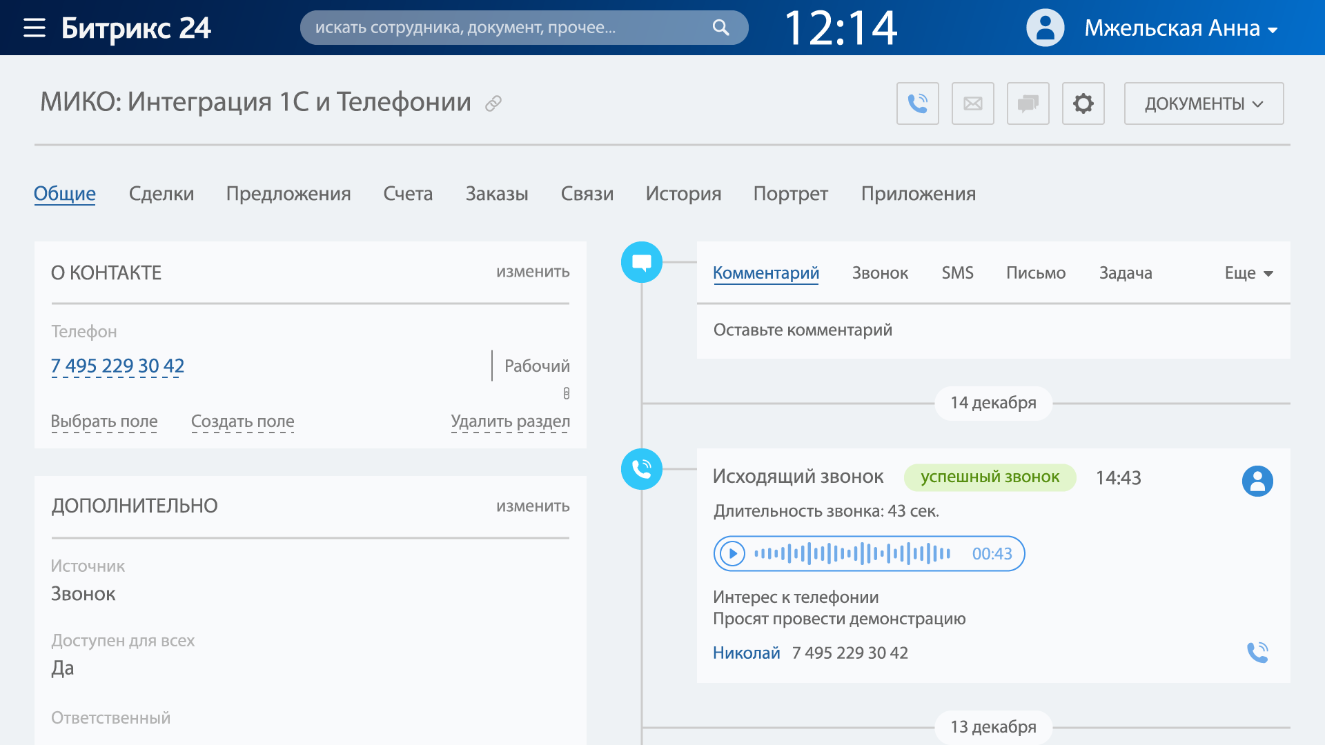 - Записи звонков привязываются к Лиду/Сделке/Компании/Контакту