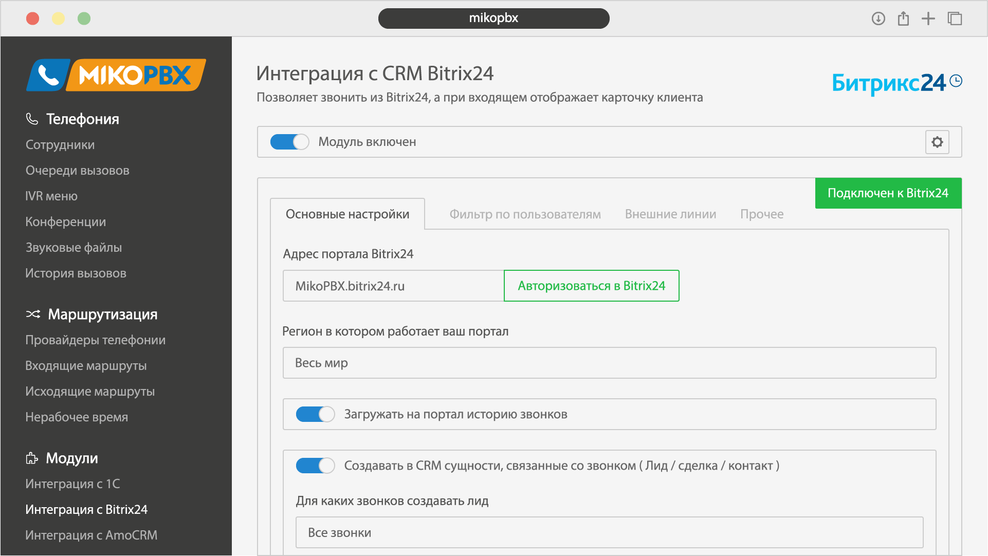 Приложение позволяет контролировать все звонки с бесплатной АТС MikoPBX внутри CRM Битрикс24 с привязкой к компании или контакту c возможностью совершить, принять и прослушать разговоры в 1 клик.