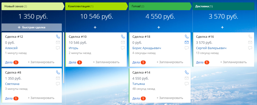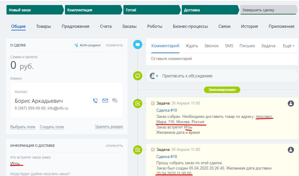 Когда менеджер подтвердит заказ и переведет сделку в стадию комплектации, CRM сама проставит задачу в отдел сборки заказов.