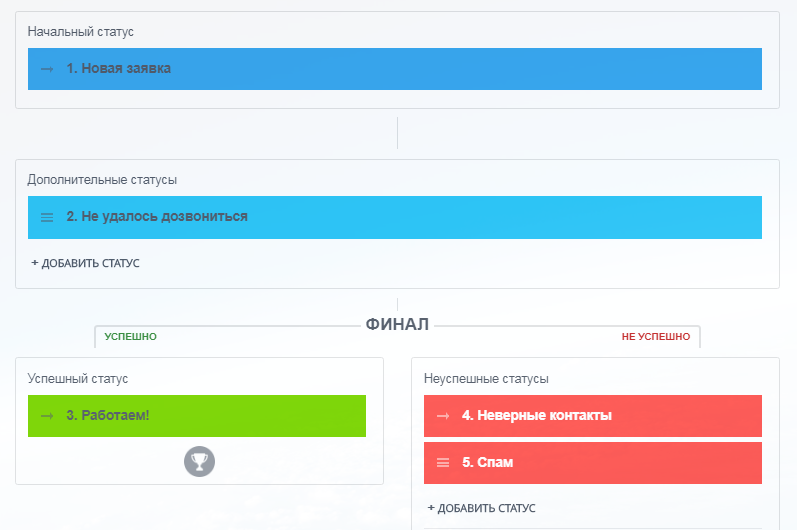 Попадая в систему, каждый контакт становится лидом. Вы можете решить его судьбу: качественные контакты - в сделку, спам - в спам. Есть и промежуточная стадия "Не дозвонился" - для тех, кому надо набрать попозже еще раз. Мы убрали все лишнее!