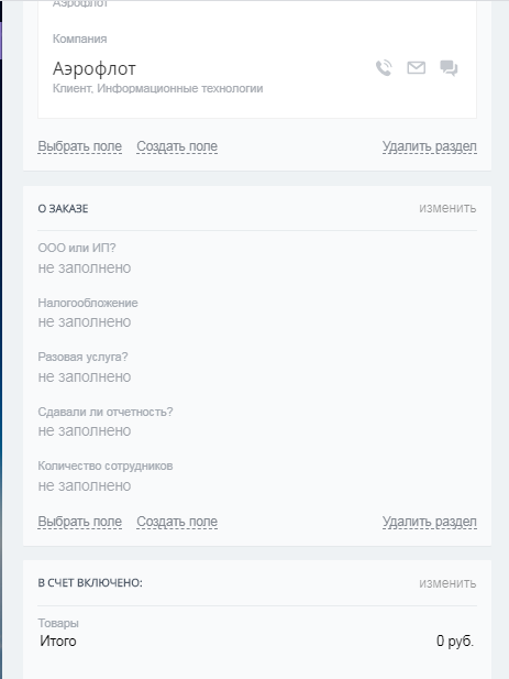 1) Бухгалтерия. Когда приходит заказ на услуги бухгалтера, то переносите сделку именно сюда. Если клиент регулярный, создавайте регулярные сделки или регулярные счета, отправляемые автоматически. Здесь есть удобная карточка сделки: вы сможете указать основные данные вашего клиента, тип фирмы, систему налогообложения, количество сотрудников. Кстати, если бюджет больше 50 000 руб., то руководитель получит извещение об этом.