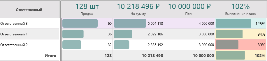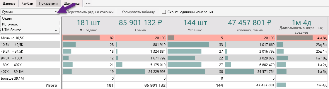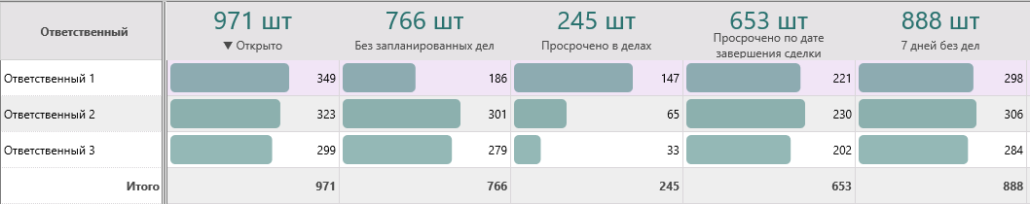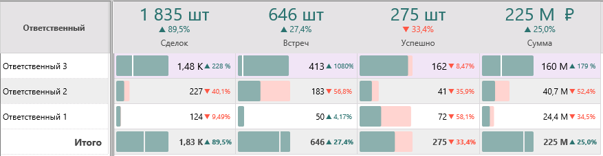 - Вывод нескольких показателей в одной таблице, например, количество и сумма целевых лидов или сделок, а также звонков менеджеров по продажам.