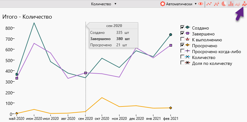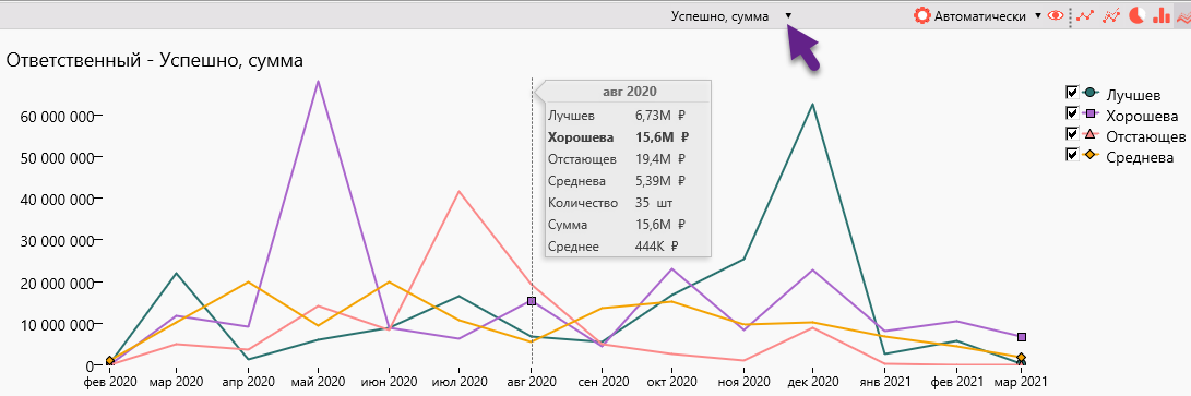 - Настройка диаграммы в один клик: Количество, Сумма, Среднее, Доля по сумме и количеству