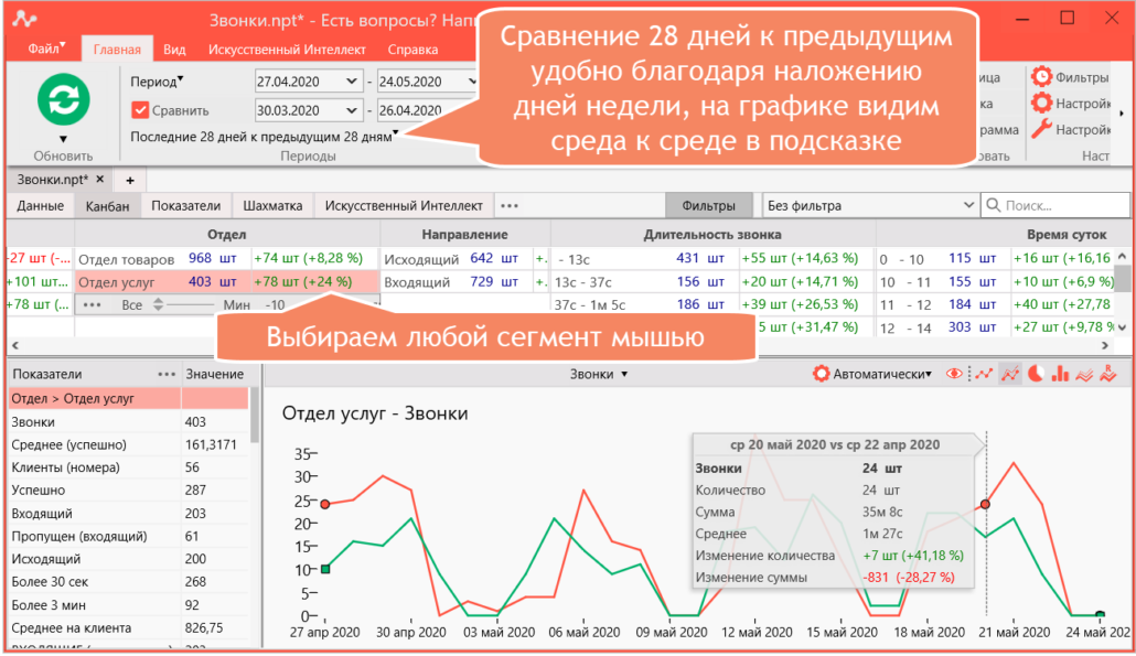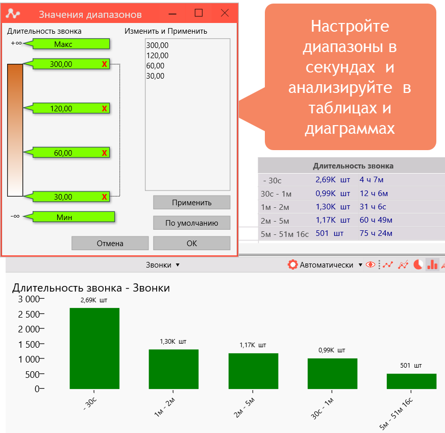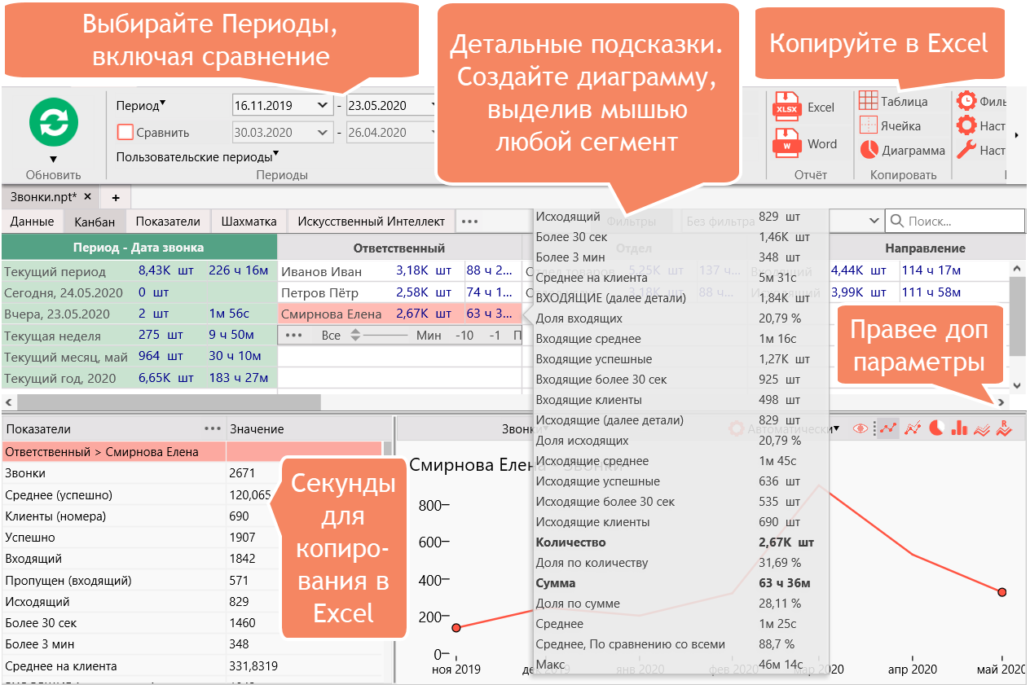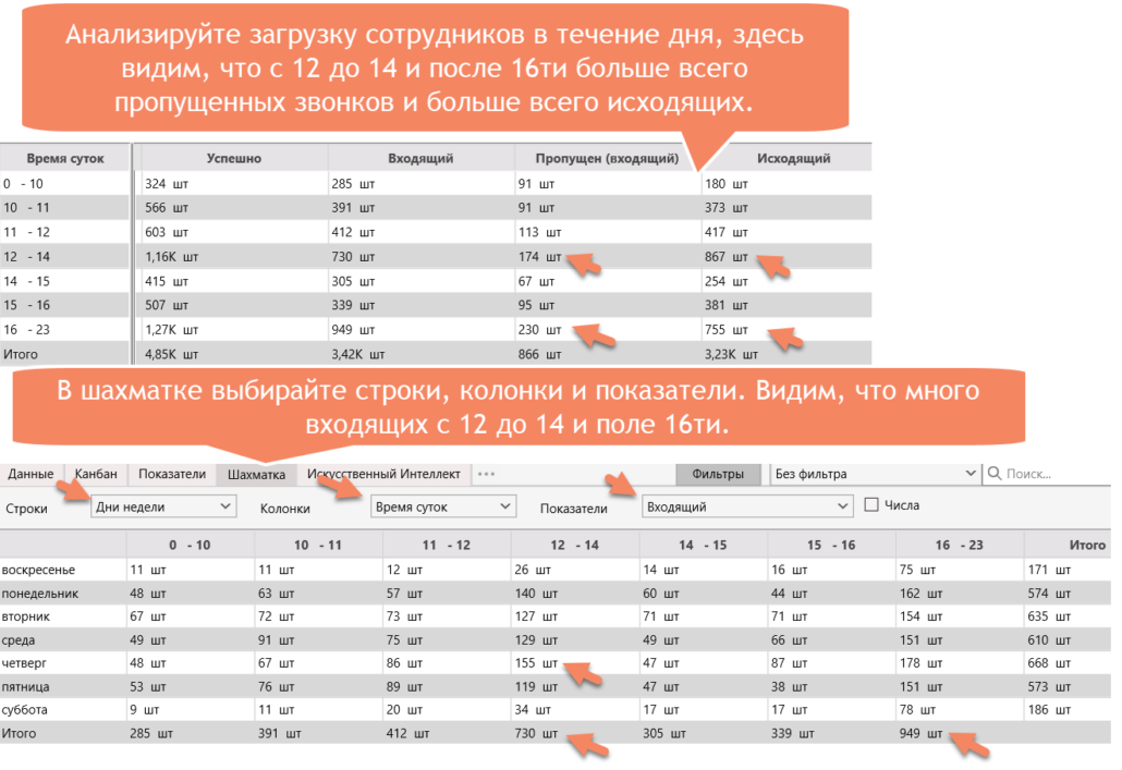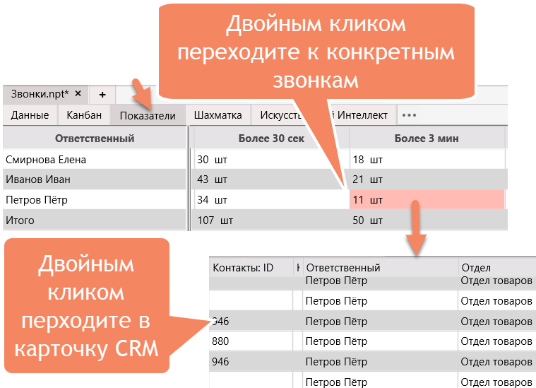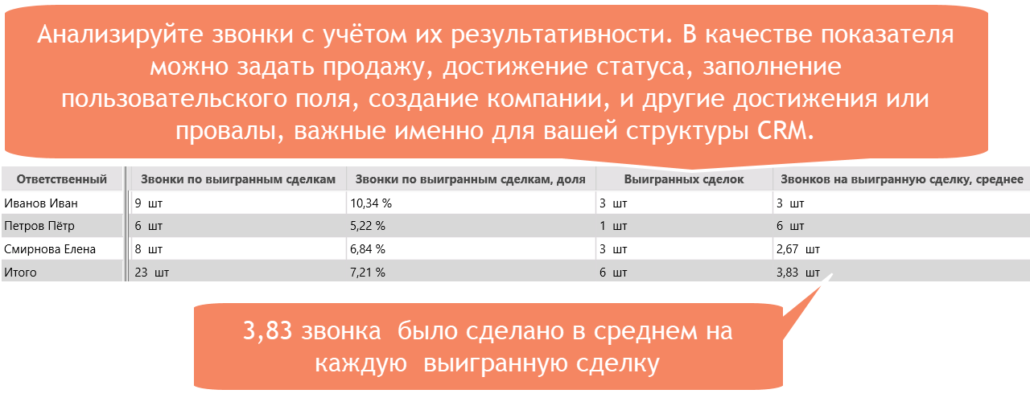 - Анализ звонков: количество и продолжительность входящих, исходящих - по каждому менеджеру, городу или иному разрезу.