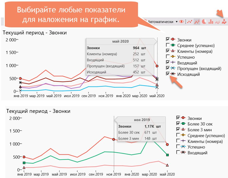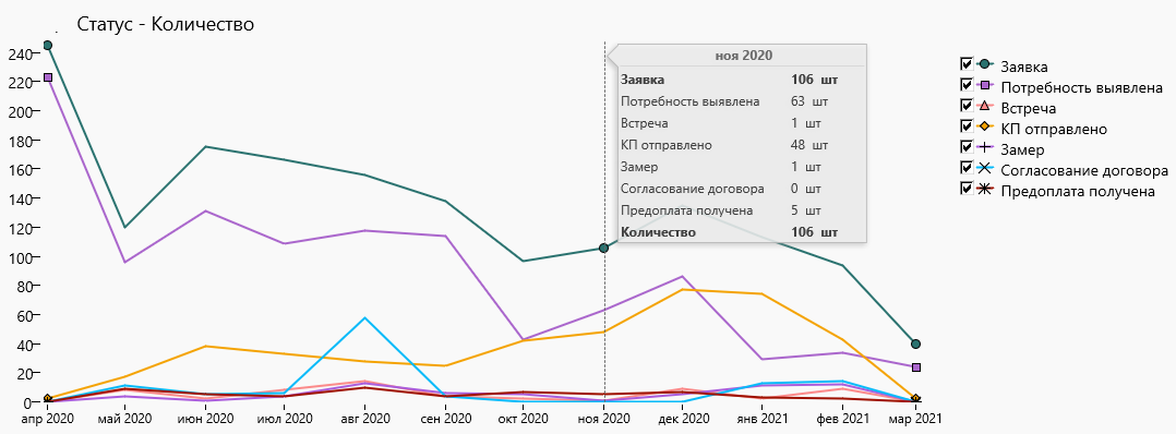 - Подсказки к диаграммам покажут дополнительную информацию: сумму, количество и тренды по ним