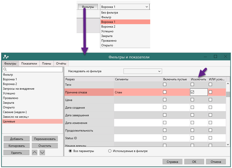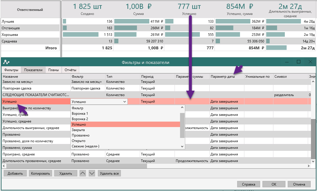 - Настраиваемые (пользовательские) показатели и фильтры - возможность задать сложную логику расчёта (например, сколько сделок в статусе “КП” по Москве?) и применить их к любому разрезу: Ответственным, Источникам, к пользовательским полям, чтобы получить таблицу зависимостей и графики.