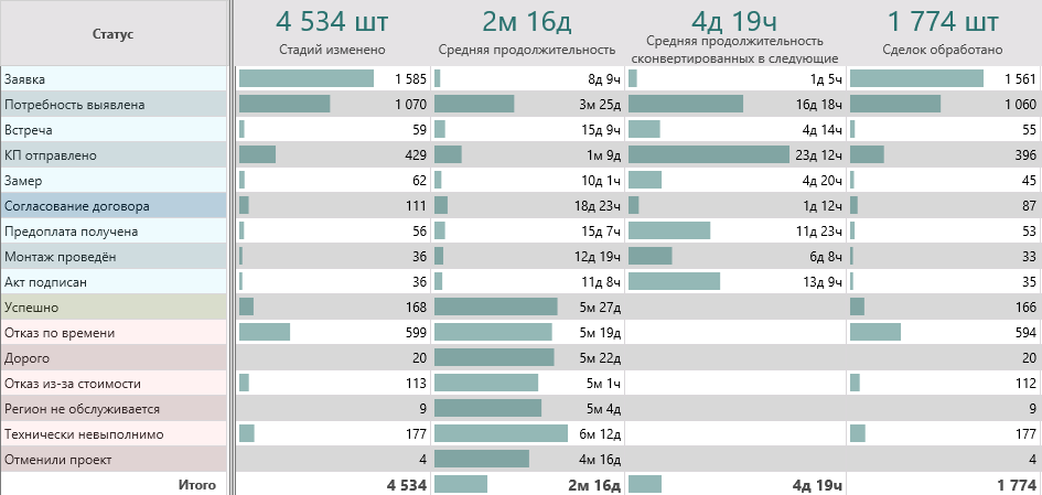 - Стадии Сделок - анализ продолжительности нахождения сделки в конкретной стадии в разрезе, с учётом рабочего времени, множество новых дополнительных показателей - Подробнее