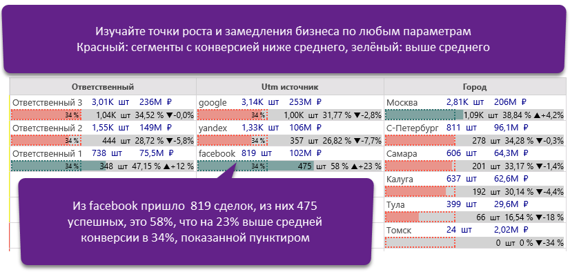 - Эффективность рекламных каналов utm: Yandex Direct, Google Adwords, facebook*, vk и другим - по продажам, по переходам на статусы или иным показателям и в любых разрезах.