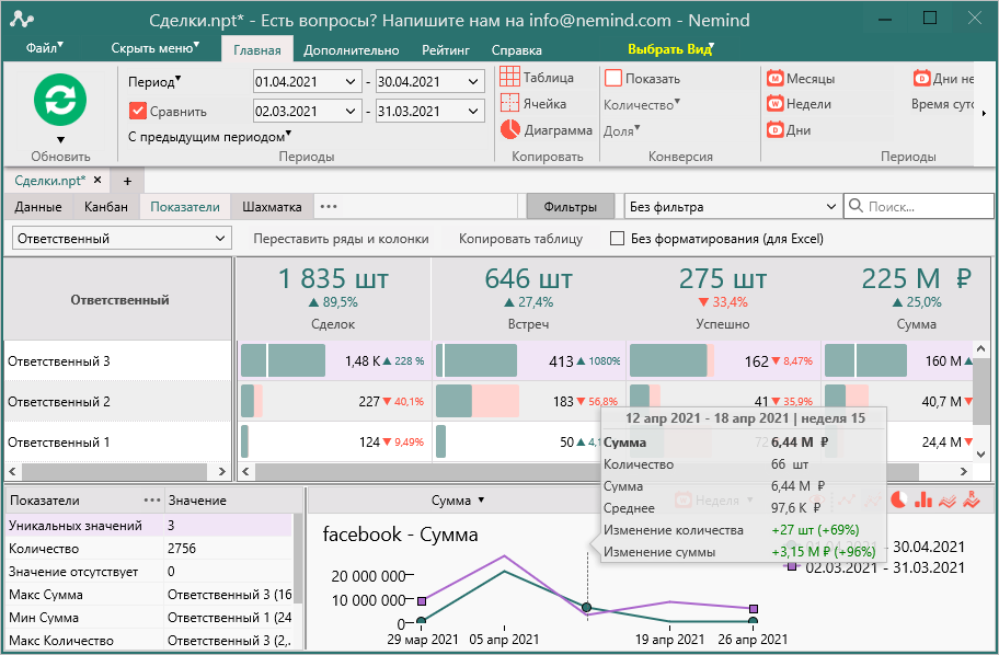 Битрикс 24 предлагает красивую встроенную аналитику, но она не всегда достаточна для создания отчётов с учётом особенностей конкретного бизнеса. Nemind закрывает эту проблему и предлагает гибкий конструктор, чтобы в режиме no-code, то есть без программирования, создавать отчёты с новыми показателями и фильтрами, в любых разрезах от менеджеров и отделов до пользовательских полей.Что даёт программа руководителю?