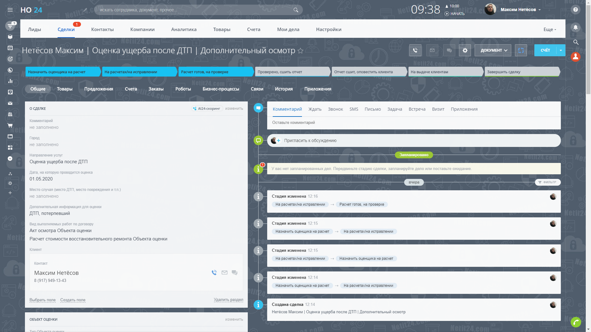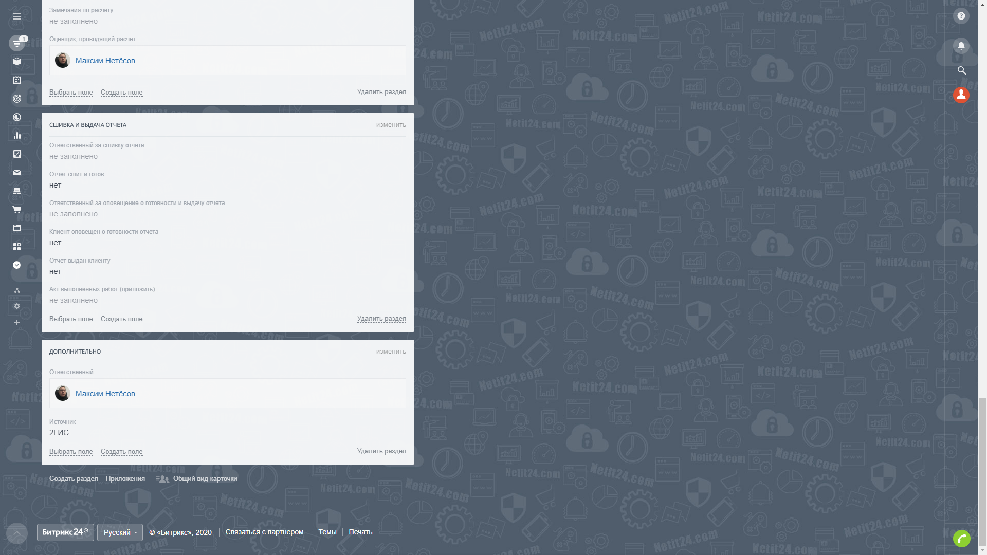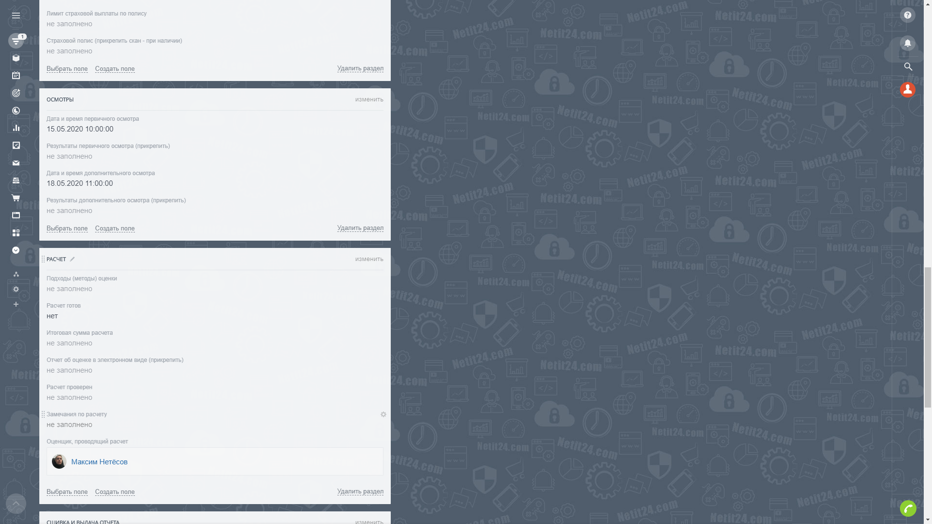 - Доступны пользовательские поля в воронке "Подготовка расчетов" - "Город", "Направление услуг", "Дата, на которую проводится оценка", "Место случая (место ДТП, место повреждения и т.п.)", "Дополнительная информация для оценки", "Вид выполняемых работ по договору", "Тип Объекта оценки", "Наименование Объекта оценки", "Дополнительные характеристики Объекта оценки (гос.номер ТС, кадастровый номер и т.п.)", "Собственник Объекта оценки", "Тип документа на право собственности", "Серия и номер документа на право собственности", "Кем выдан документ на право собственности", "Дата выдачи документа на право собственности", "Документы на Объект оценки (прикрепить)", "Местонахождение Объекта оценки", "Причинитель вреда", "Размер полученного возмещения ущерба", "Дата получения возмещения", "Страховщик", "Страховой полис (по которому получаем выплату)", "Лимит страховой выплаты по полису", "Страховой полис (прикрепить скан - при наличии)", "Дата и время первичного осмотра", "Результаты первичного осмотра (прикрепить)", "Дата и время дополнительного осмотра", "Результаты дополнительного осмотра (прикрепить)", "Оценщик, проводящий расчет", "Подходы (методы) оценки", "Расчет готов", "Итоговая сумма расчета", "Отчет об оценке в электронном виде (прикрепить)", "Расчет проверен", "Замечания по расчету", "Ответственный за сшивку отчета", "Отчет сшит и готов", "Ответственный за оповещение о готовности и выдачу отчета", "Клиент оповещен о готовности отчета", "Отчет выдан клиенту", "Акт выполненных работ (приложить)";