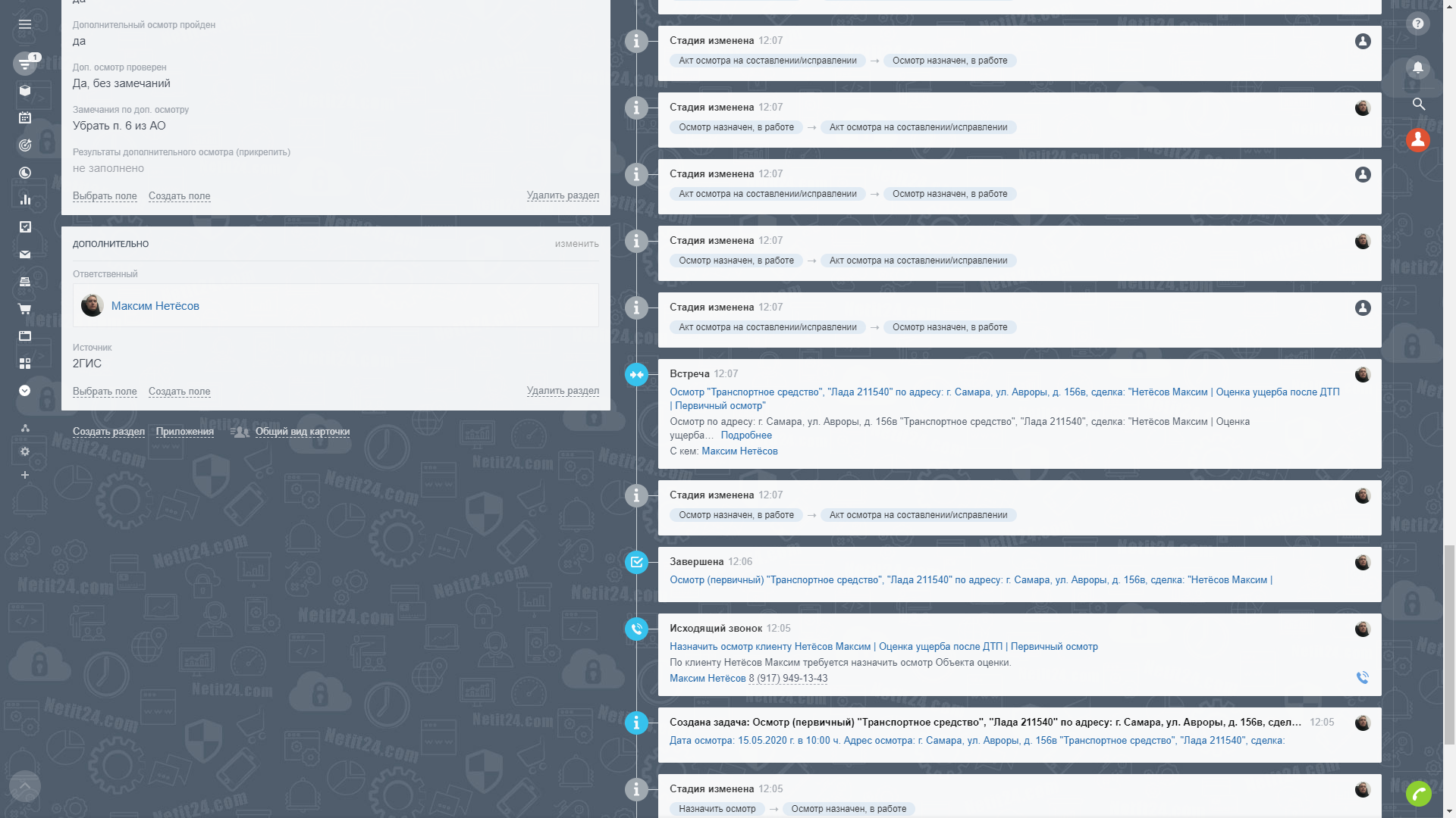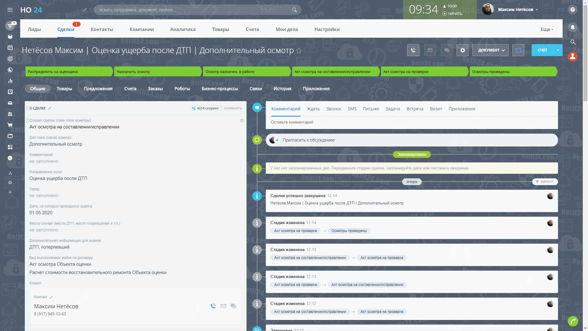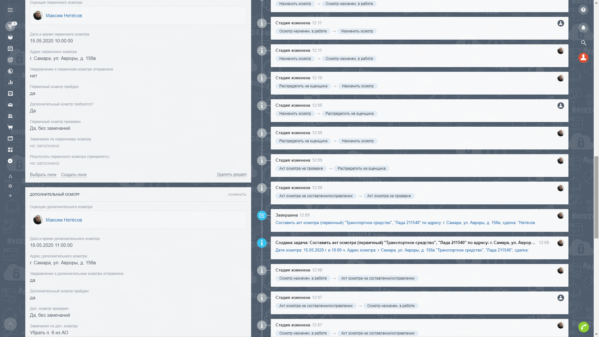 - настроенные карточки сделки для проведения осмотра (на два осмотра - первичный и дополнительный осмотры);