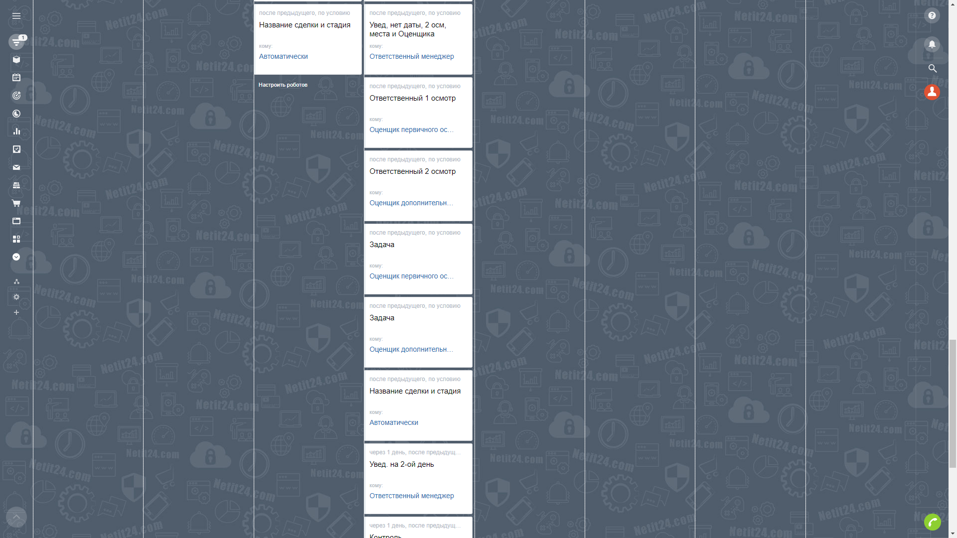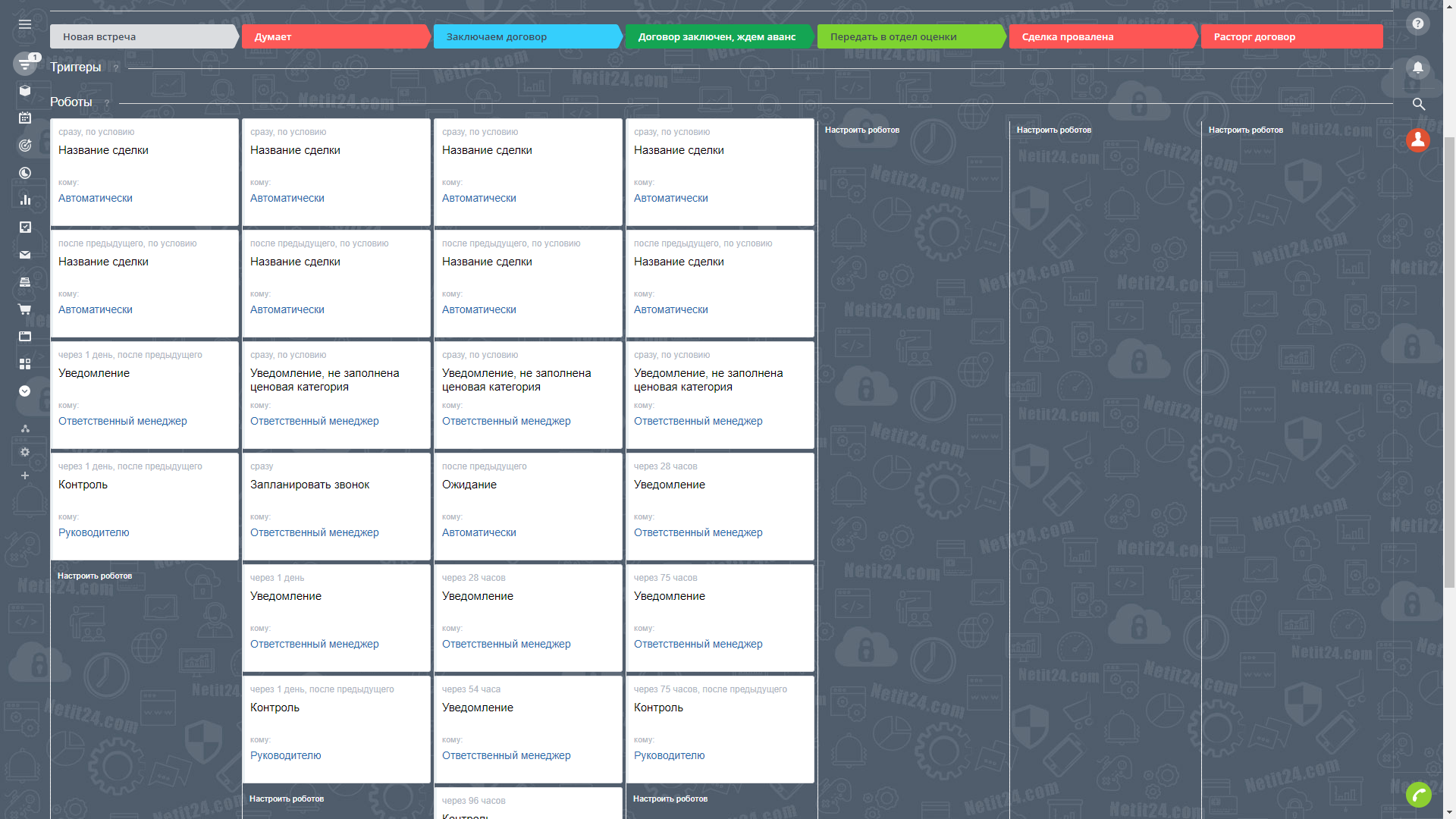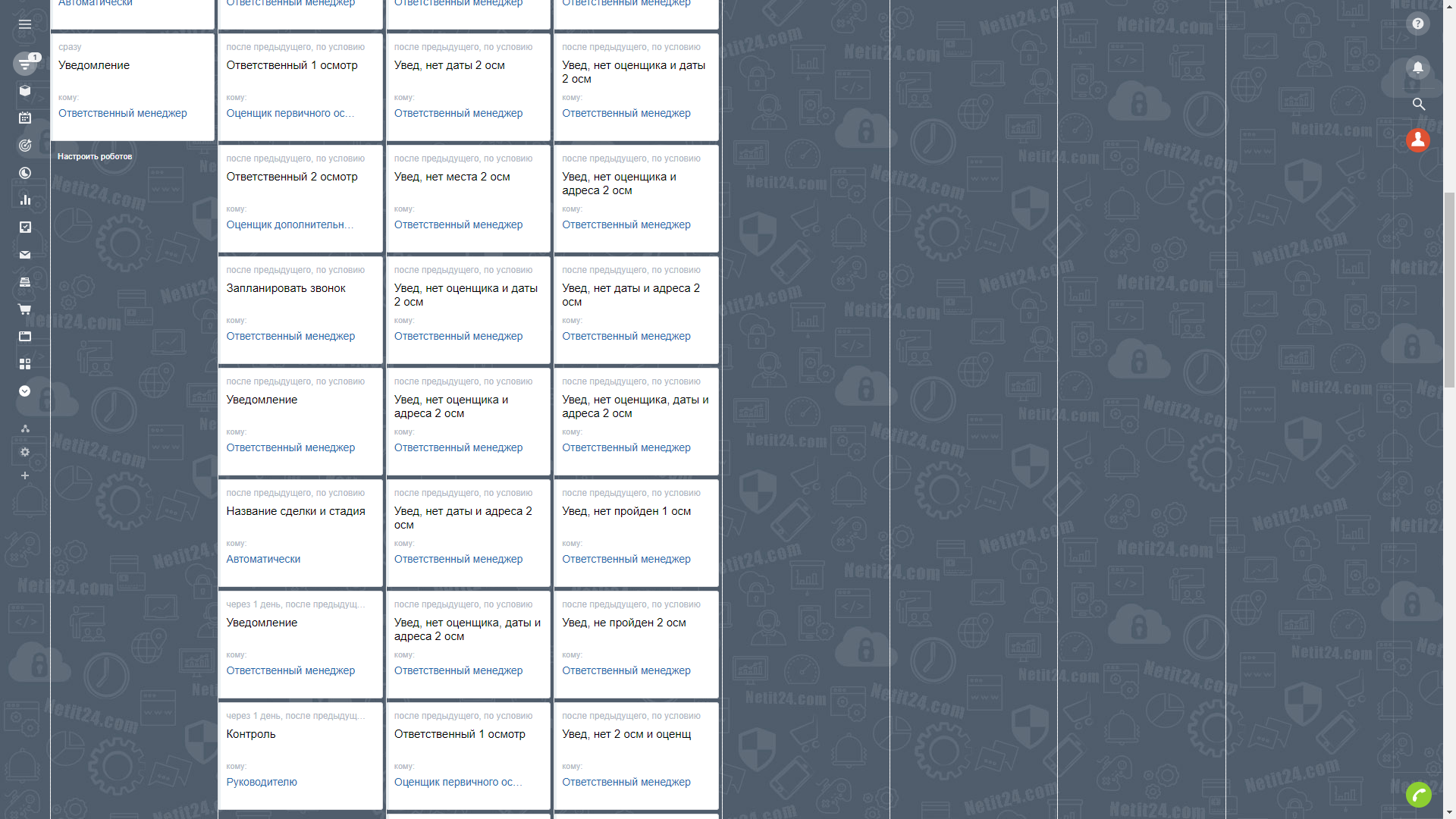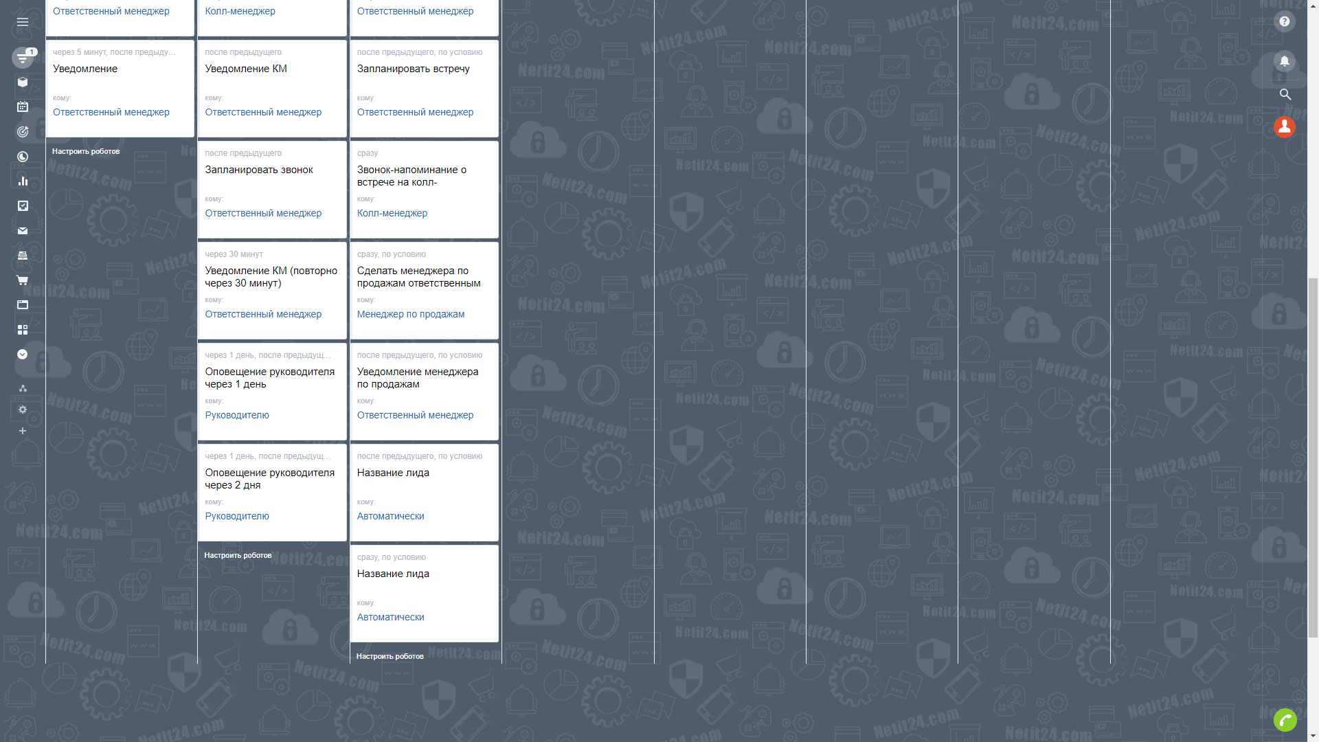 - роботы-уведомления на этапах поступления заявок/сделок по основным этапам работы с клиентами.