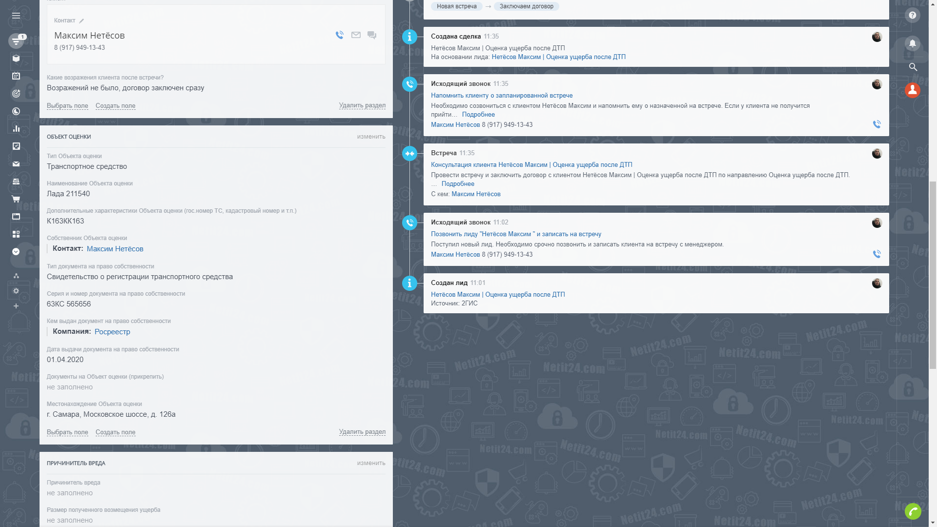 - Доступны пользовательские поля в воронке "Отдел продаж" - "Дата и время встречи", "Направление услуг", "Ценовая категория", "Город", "Дата, на которую проводится оценка", "Место случая (место ДТП, место повреждения и т.п.)", "Дополнительная информация для оценки", "Вид выполняемых работ по договору", "Колл-менеджер", "Менеджер по продажам", "Какие возражения клиента после встречи?", "Тип Объекта оценки", "Наименование Объекта оценки", "Дополнительные характеристики Объекта оценки (гос.номер ТС, кадастровый номер и т.п.)", "Собственник Объекта оценки", "Тип документа на право собственности", "Серия и номер документа на право собственности", "Кем выдан документ на право собственности", "Дата выдачи документа на право собственности", "Документы на Объект оценки (прикрепить)", "Местонахождение Объекта оценки", "Причинитель вреда", "Размер полученного возмещения ущерба", "Дата получения возмещения", "Страховщик", "Страховой полис (по которому получаем выплату)", "Лимит страховой выплаты по полису", "Страховой полис (прикрепить скан - при наличии)"