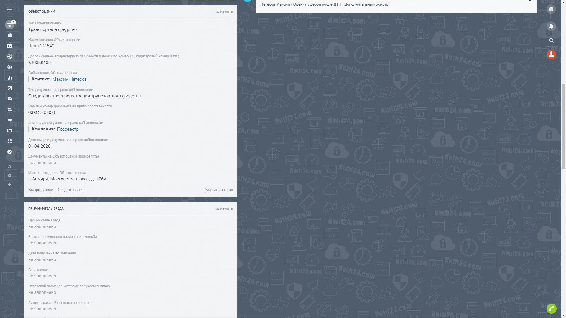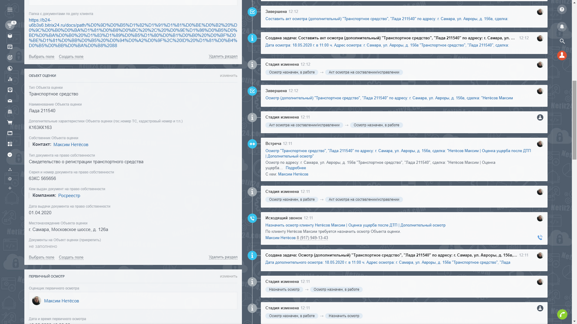 - Доступны пользовательские поля в воронке "Проведение осмотров" - "Направление услуг", "Город", "Дата, на которую проводится оценка", "Место случая (место ДТП, место повреждения и т.п.)", "Дополнительная информация для оценки", "Вид выполняемых работ по договору", "Папка с документами по делу клиента", "Тип Объекта оценки", "Наименование Объекта оценки", "Дополнительные характеристики Объекта оценки (гос.номер ТС, кадастровый номер и т.п.)", "Собственник Объекта оценки", "Тип документа на право собственности", "Серия и номер документа на право собственности", "Кем выдан документ на право собственности", "Дата выдачи документа на право собственности", "Местонахождение Объекта оценки", "Документы на Объект оценки (прикрепить)", "Оценщик первичного осмотра", "Дата и время первичного осмотра", "Адрес первичного осмотра", "Уведомление о первичном осмотре отправлено", "Первичный осмотр пройден", "Дополнительный осмотр требуется?", "Первичный осмотр проверен", "Замечания по первичному осмотру", "Результаты первичного осмотра (прикрепить)", "Оценщик дополнительного осмотра", "Дата и время дополнительного осмотра", "Адрес дополнительного осмотра", "Уведомление о дополнительном осмотре отправлено", "Дополнительный осмотр пройден", "Доп. осмотр проверен", "Замечания по доп. осмотру", "Результаты дополнительного осмотра (прикрепить)".