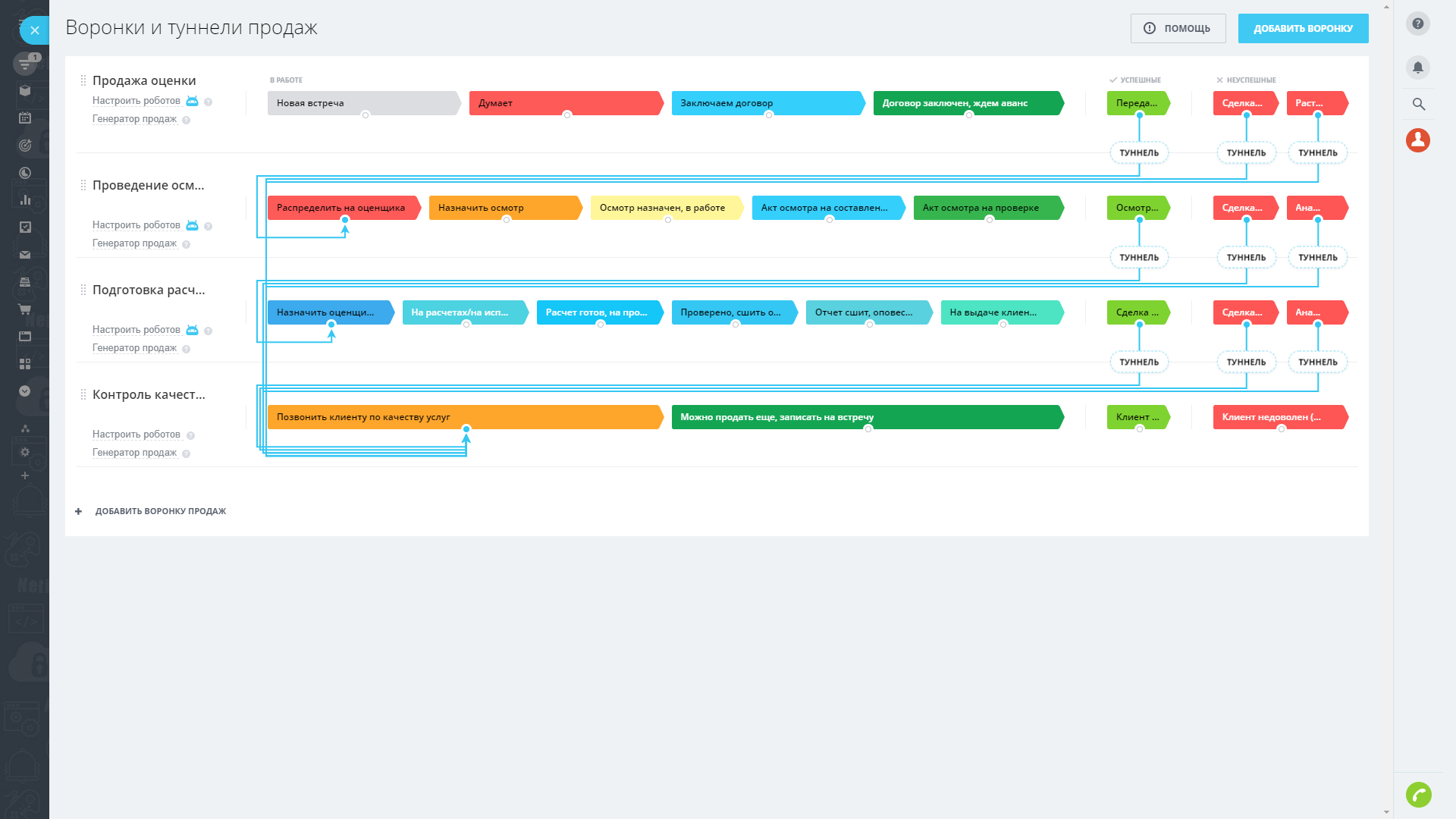 - Туннель между воронками "Отдел продаж" и "Проведение осмотров";