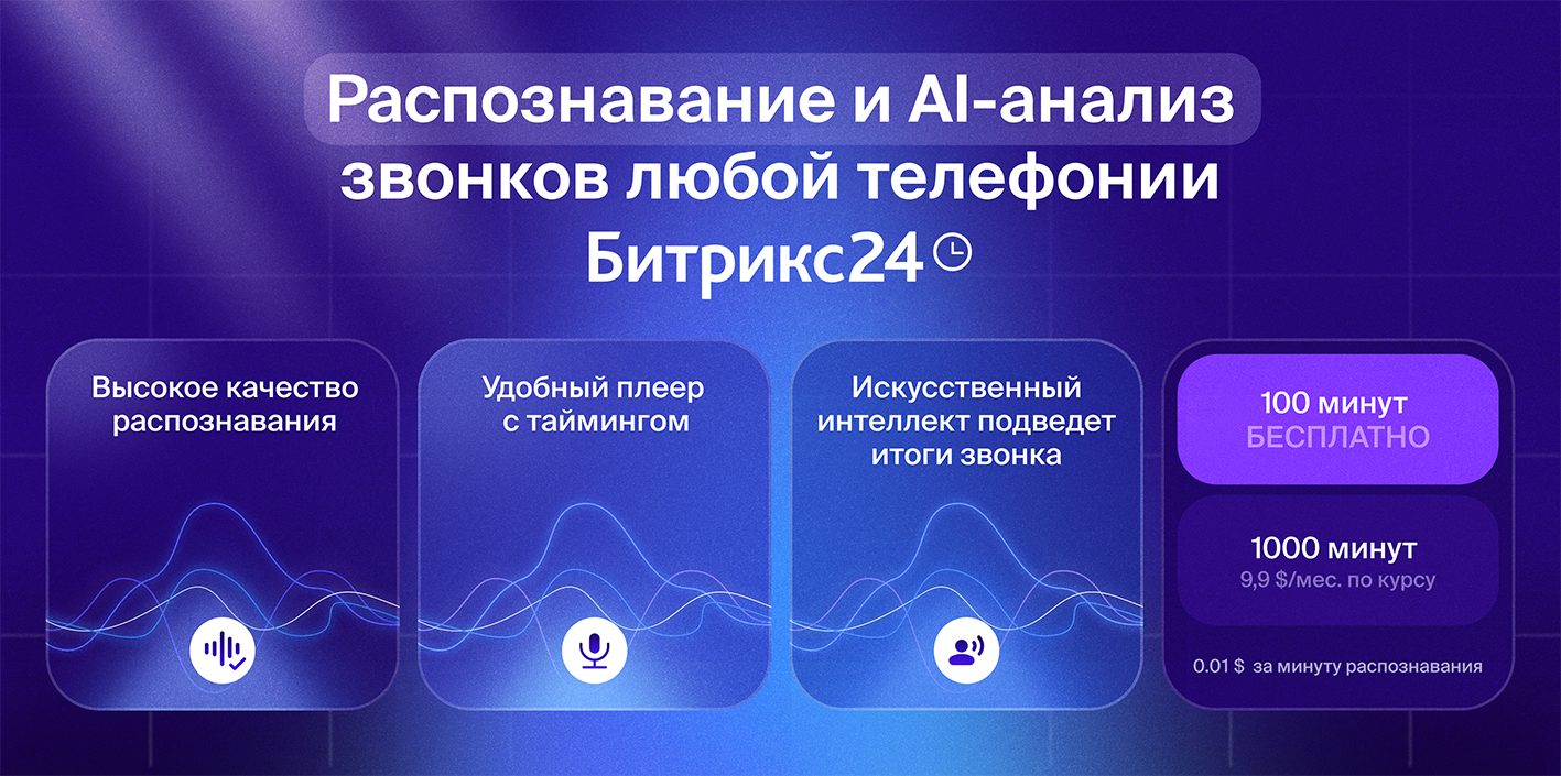 • Автоматическая транскрипция звонков Каждая запись телефонного разговора, доступная для прослушивания в Bitrix24, может быть преобразована в текст. Это избавляет сотрудников от необходимости вручную переслушивать звонки и позволяет быстрее находить нужную информацию.