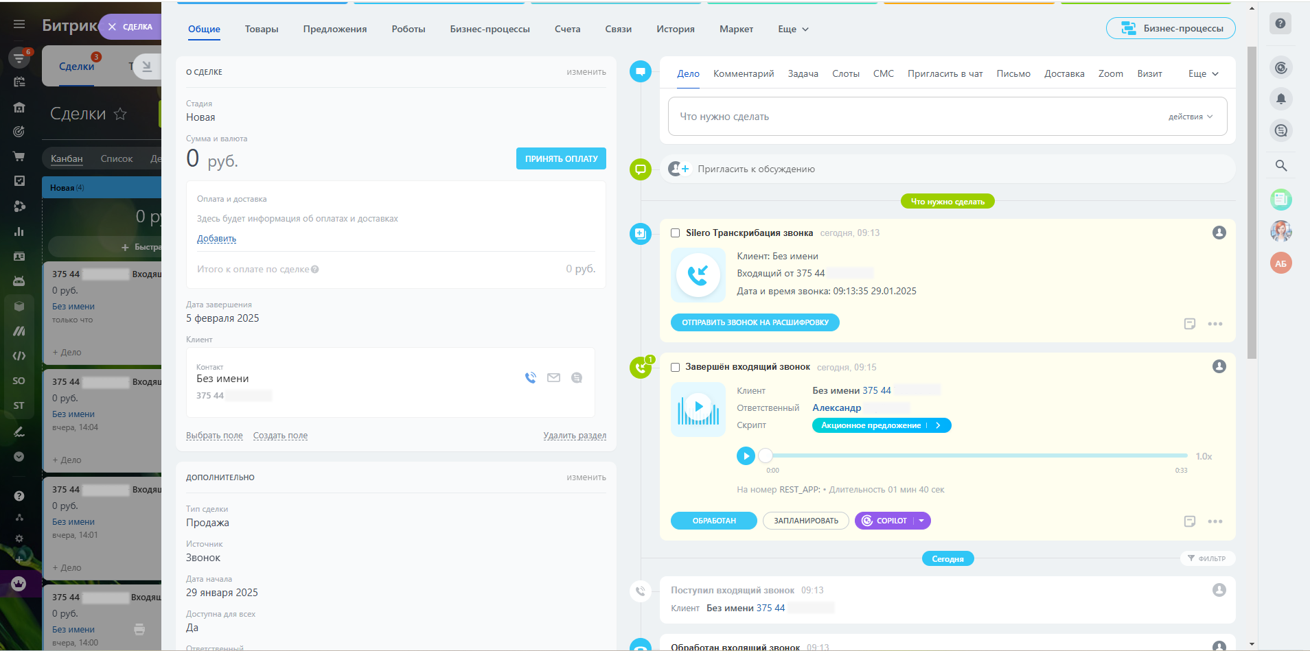 • Интеграция с CRM Транскрипт прикрепляется прямо к карточке клиента. Менеджер видит текст разговора в привычном интерфейсе и может сразу использовать его для анализа, уточнения деталей или подготовки следующего контакта.