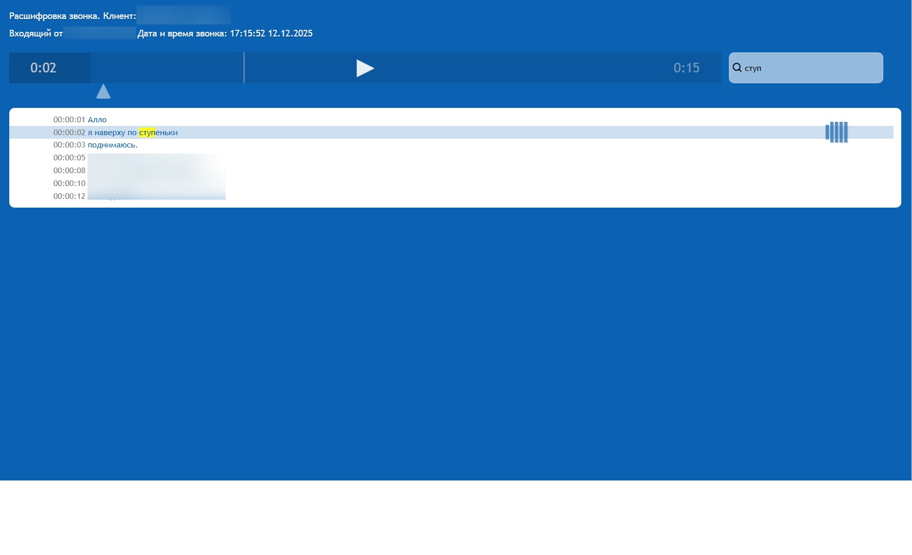 • Удобный плеер Встроенный плеер позволяет одновременно слушать запись и видеть подсветку текста. Есть поиск по словам и навигация по диалогу, что делает работу с длинными звонками максимально удобной.