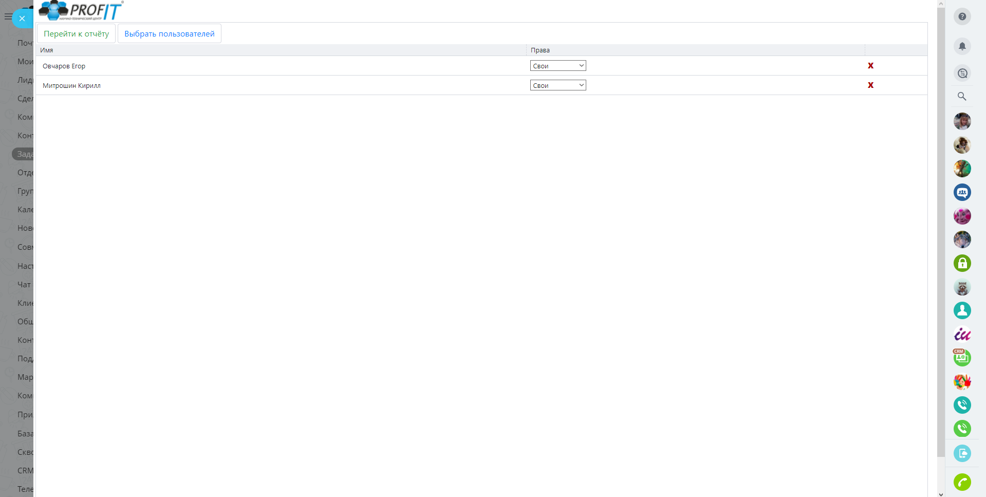 В настройках можно добавлять сотрудников, которые попадают в отчет, и устанавливать им права на просмотр.