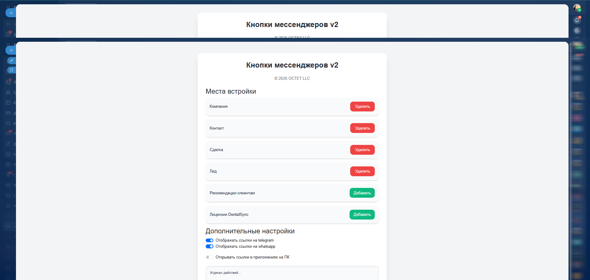 Добавляет в карточки лидов, контактов, компаний, сделок и смарт-процессов кнопки для мгновенного перехода в WhatsApp и Telegram. Номера автоматически определяются, включая привязанные компании и контакты в сделках и смарт-процессах.