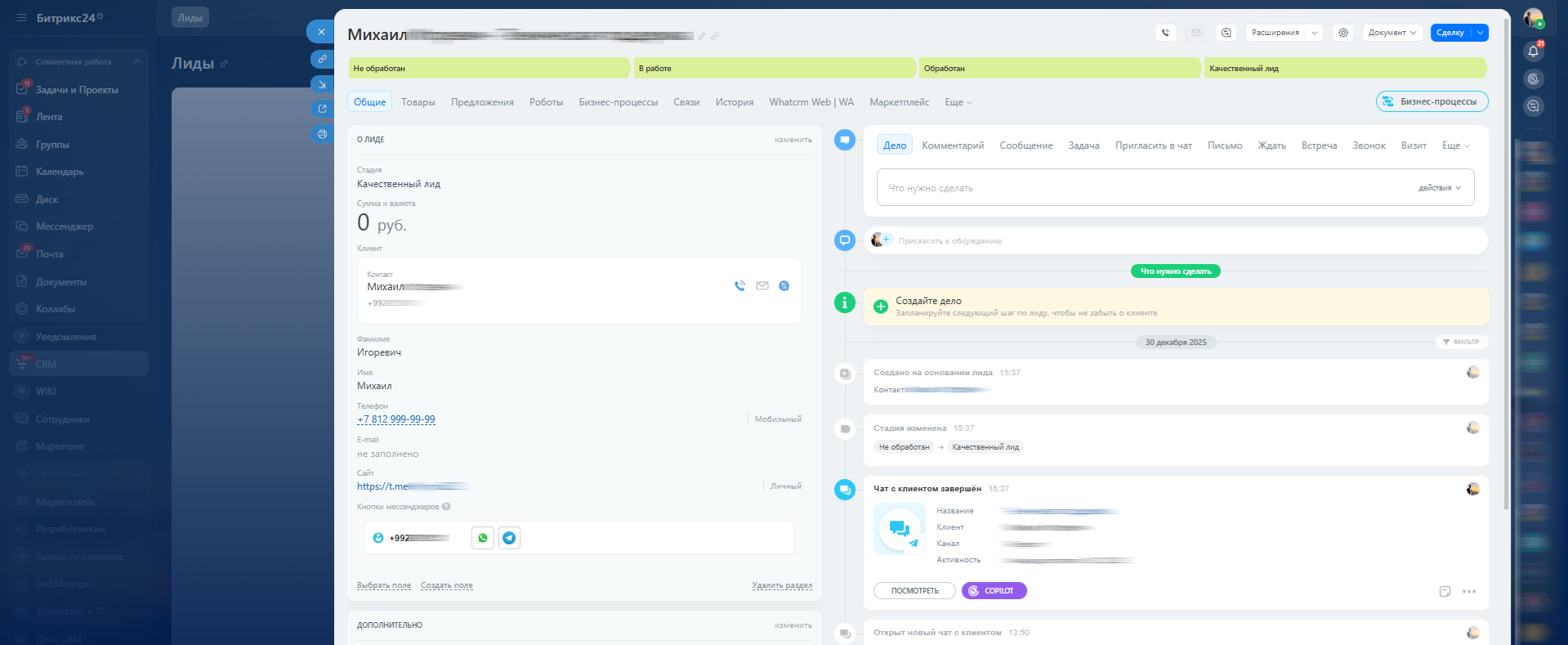 Связь с клиентом мгновенно: WhatsApp и Telegram в карточке