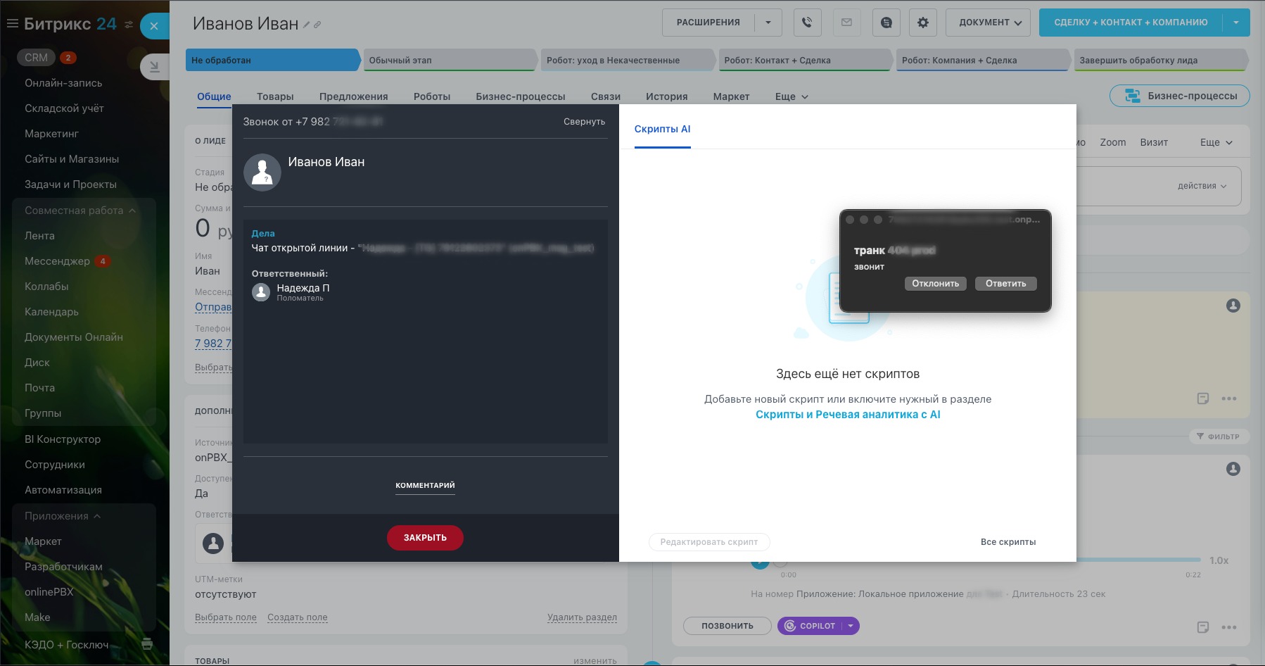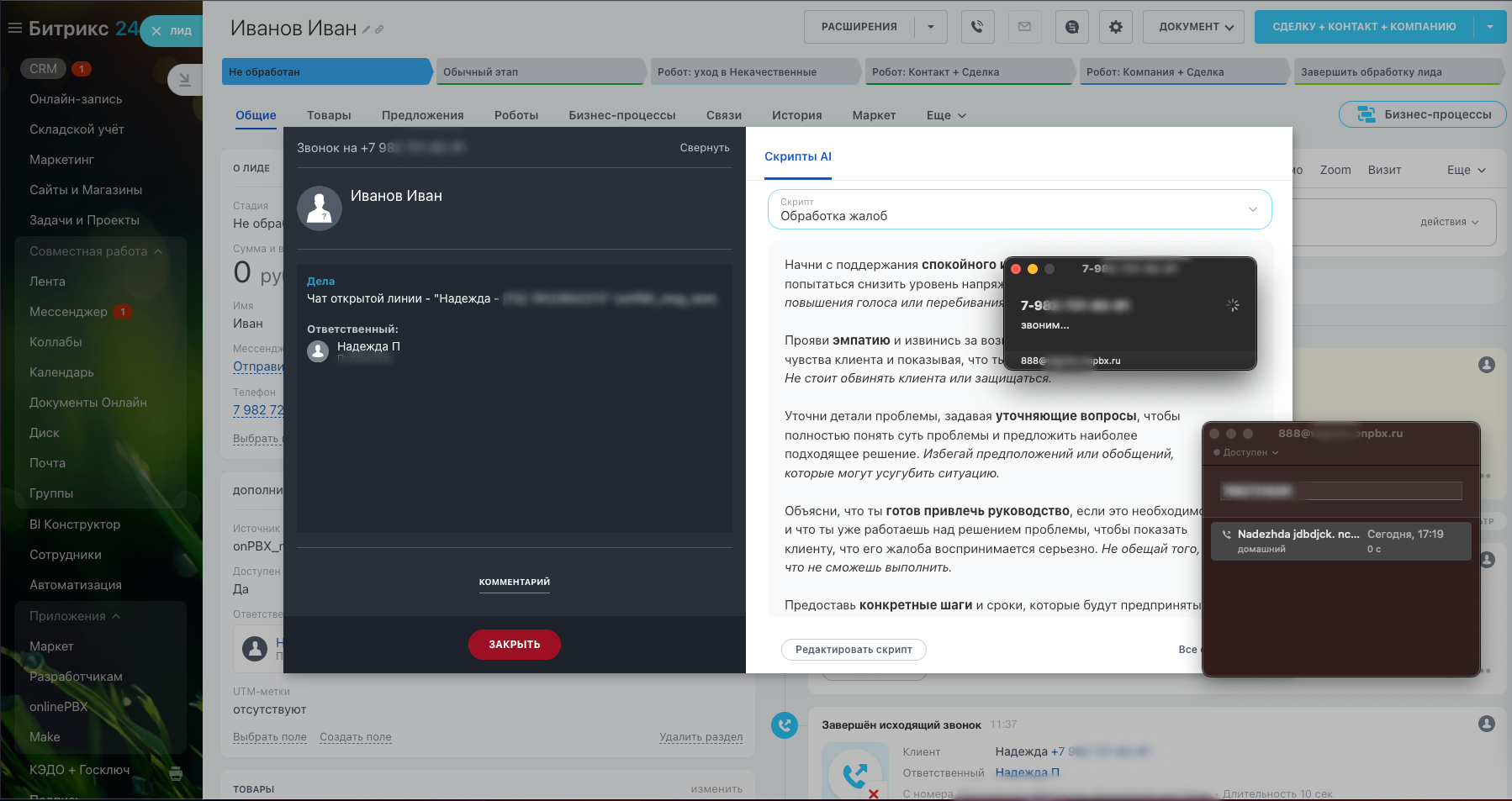 С помощью интеграции звоните клиентам из CRM, принимайте входящие и назначайте клиентам ответственных, оставляйте комментарии, создавайте контакты или лиды для новых клиентов.