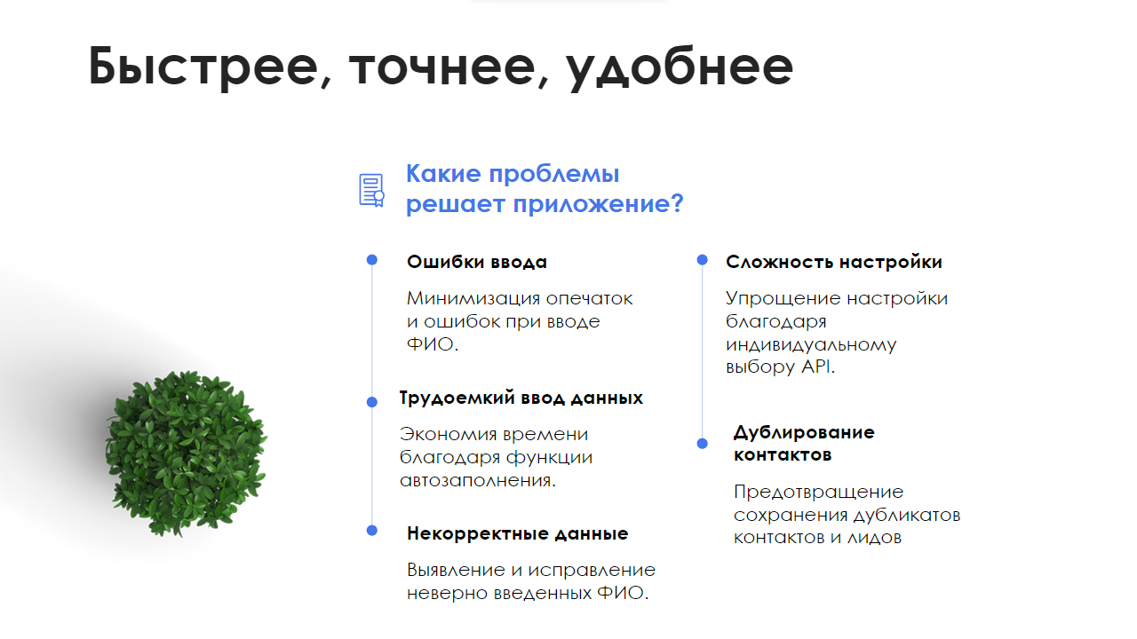 Это интуитивное приложение, которое облегчает работу с контактами и лидами, автоматически заполняя и валидируя ФИО, экономя ваше время и избегая ошибок.