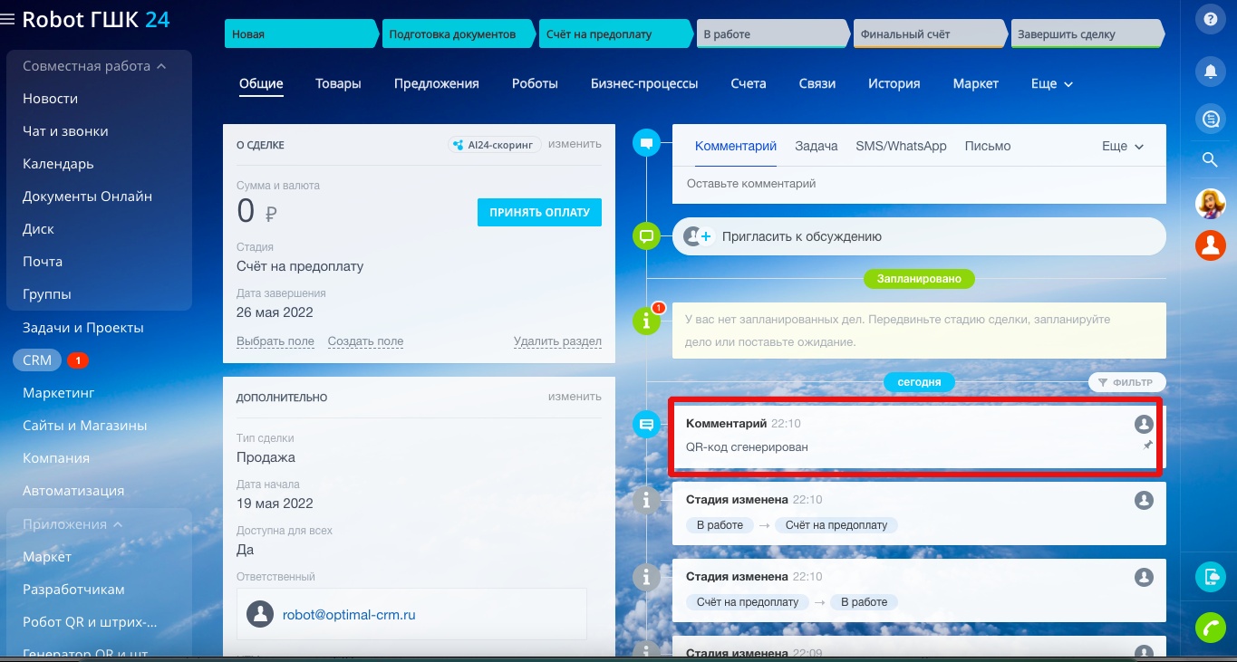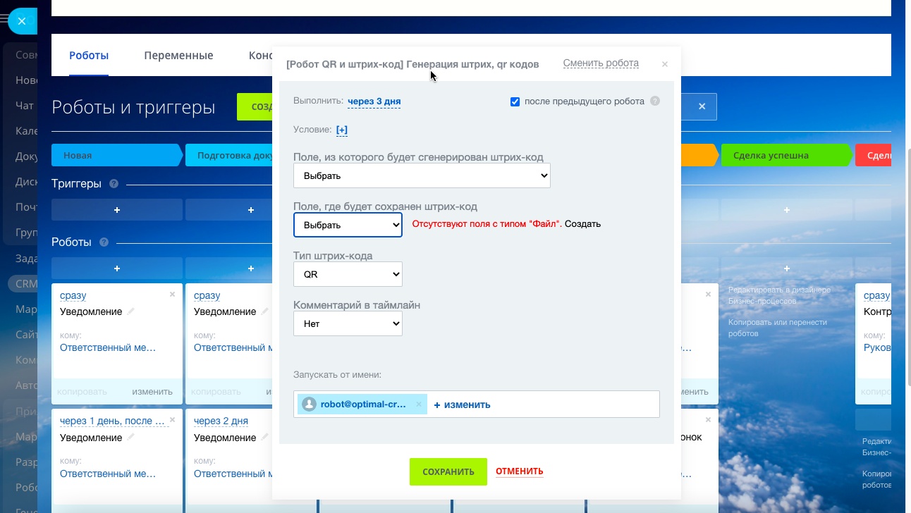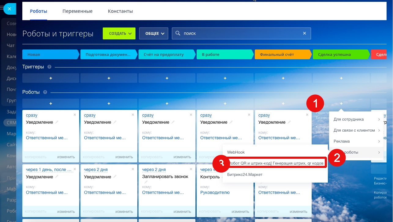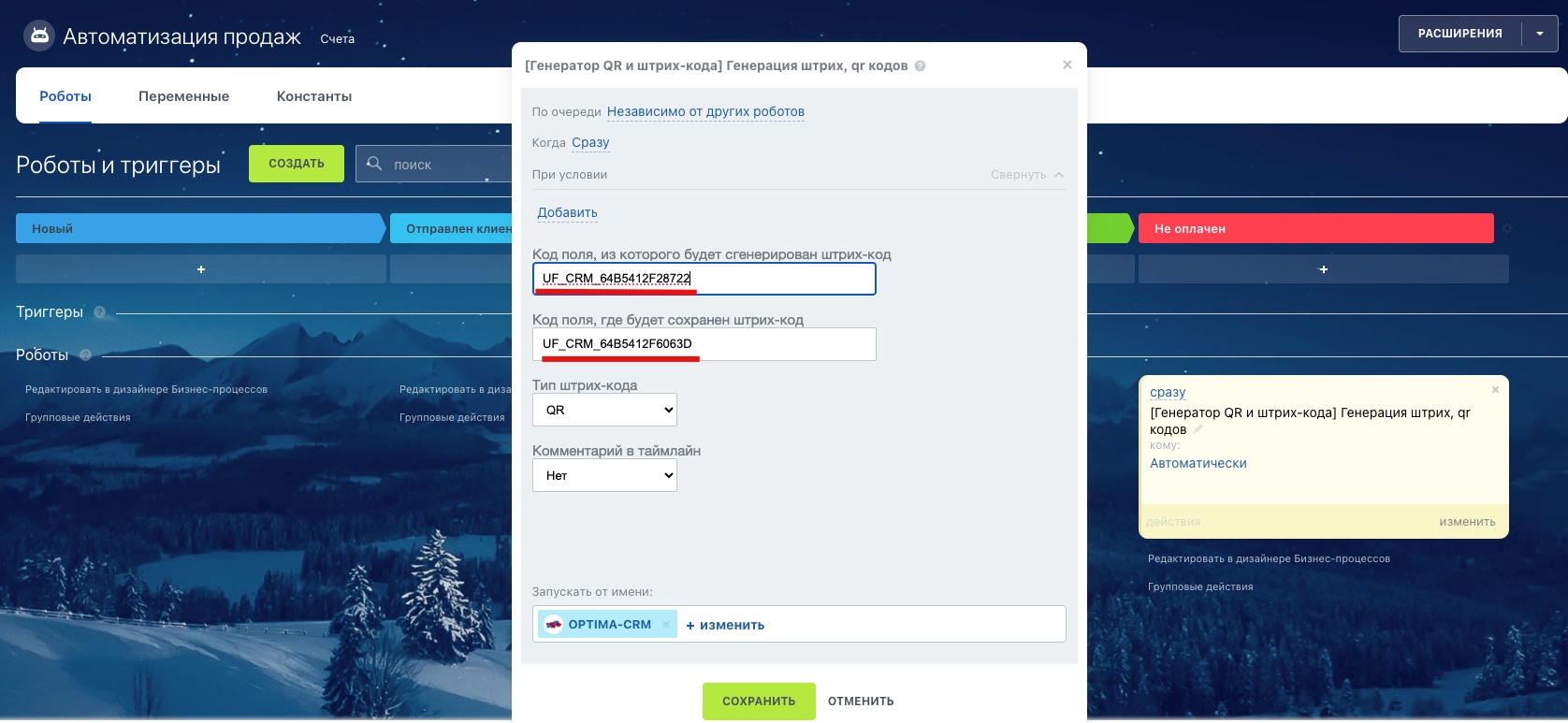 04.05.24 Добавлена возможность генерации QR и штрих-кодов для Счетов (на смарт-процессах) и для всех созданных пользователем смарт-процессов, где включена опция роботов и/или бизнес-процессов