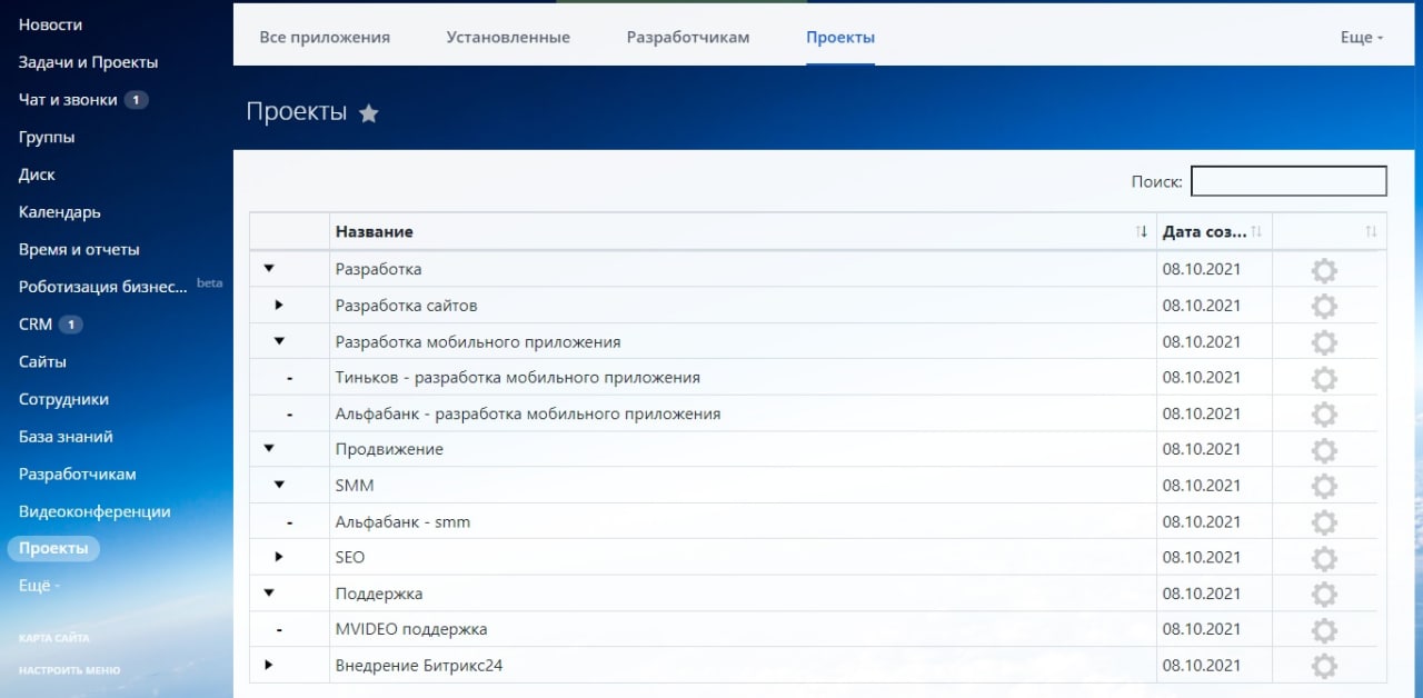 Одним из вариантов составление структуры можно сделать разделение проектов по типам. К примеру, проекты отдела продаж, проекты производства. Для этого необходимо создать соответствующие проекты (группы), которые станут родительскими, и дочерними привязать существующие проекты.