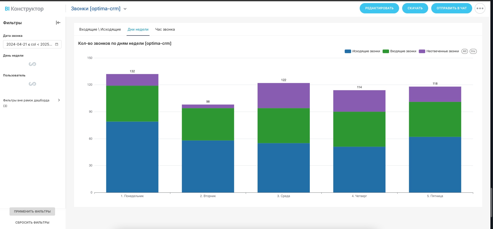 В него включены показатели по работе сотрудников со звонками, а также нагрузка по часам и дням недели.
