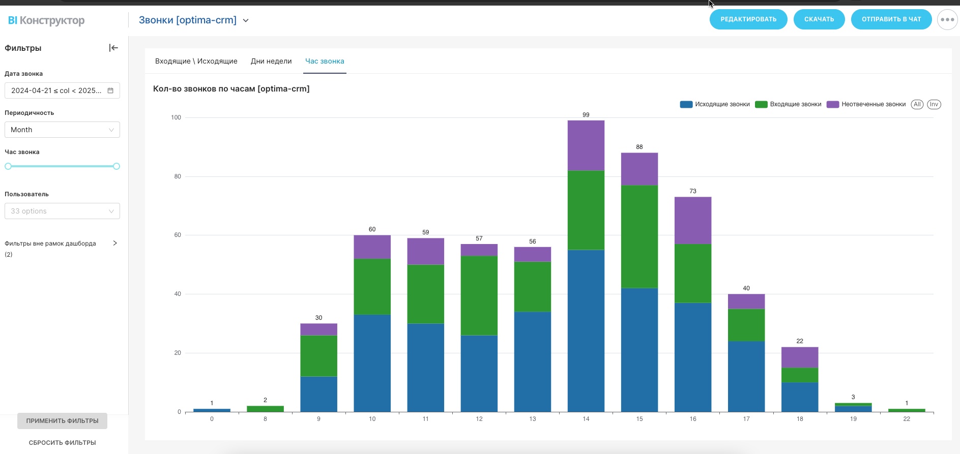 - Количество звонков по часам (вх/исх/неотвеченные)