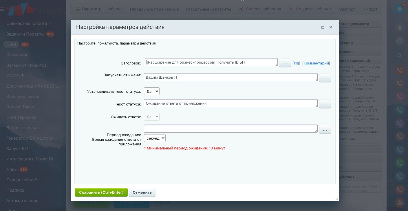 -ID задачи (надо выбрать поле или переменную, где хранится ID задачи, которую необходимо удалить. Узнать ID задачи, можно с помощью другого активити, которое входит в этот набор. Обязательно для указания)