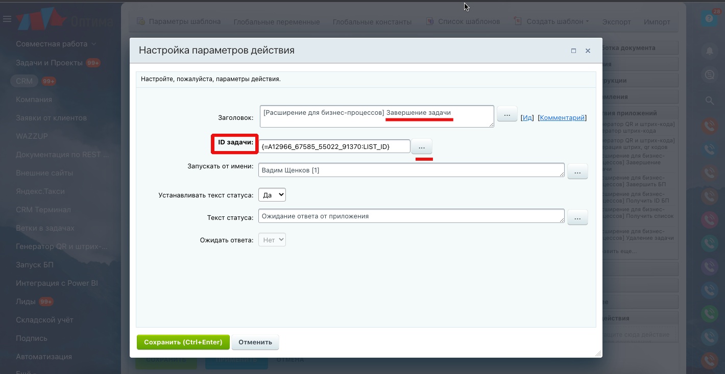 -ID задачи (надо выбрать поле или переменную, где хранится ID задачи, которую необходимо завершить. Узнать ID задачи можно с помощью другого активити, которое входит в этот набор. Обязательно для указания)
