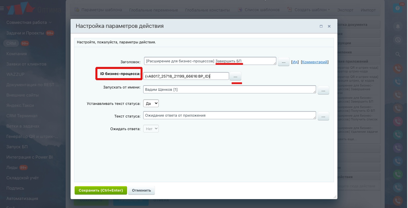 -ID бизнес-процесса (надо выбрать поле или переменную, где хранится ID бизнес-процесса, которой необходимо завершить. Получить ID бизнес-процесса можно с помощью другого активити, которое входит в этот набор. Обязательно для указания)