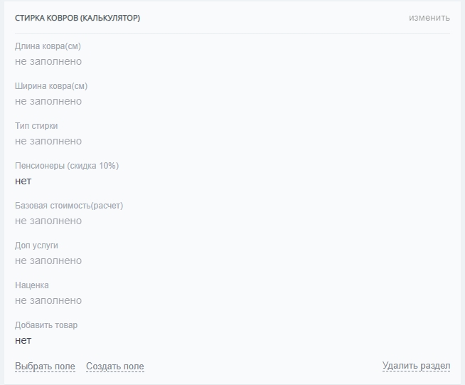 - Для "калькулятора стоимости чистки ковра": Длина ковра(см), Ширина ковра(см), Пенсионеры (скидка 10%), Площадь ковра, м.кв, Тип стирки (список), Наценка (список), Доп. услуги (список), Товар\услуга (результат расчета), Общая стоимость услуги (число с результатом расчёта).