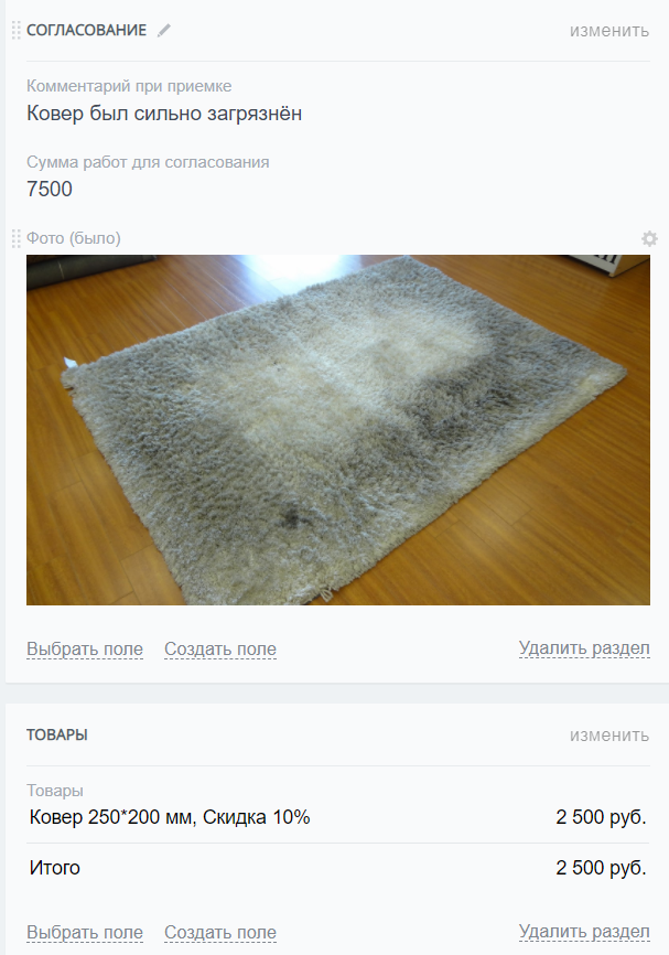 - Доставка/Приемка/Оплата - отправляем клиенту SMS со сравнительными фото ковра было/стало, создаем задачу с чек-листом, осуществляем процесс оплаты по терминалу или можно произвести оплату по SMS (требуется настройка Битрикс24), подписываем у клиента Акт. Для детализированной настройки данного этапа под вас обратитесь к нам, и мы это сделаем бесплатно!