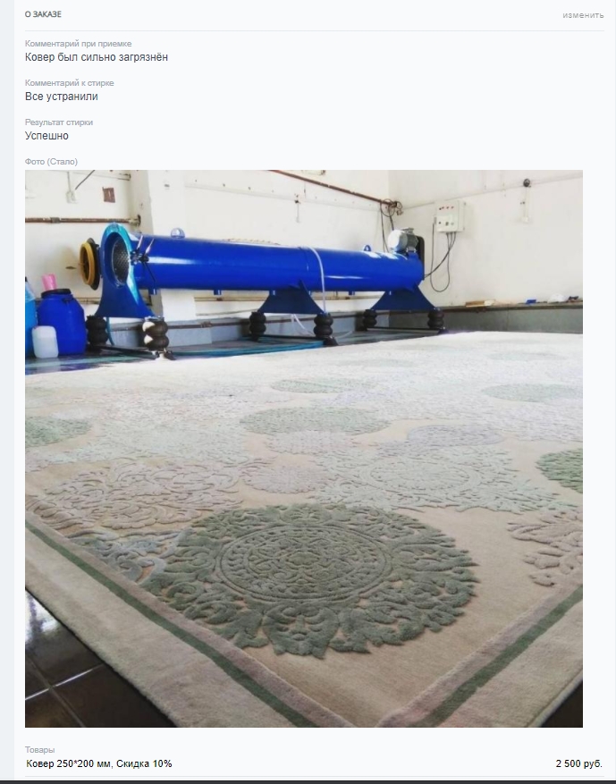 - Фото (было) - фотографируем ковер при приемке водителем.