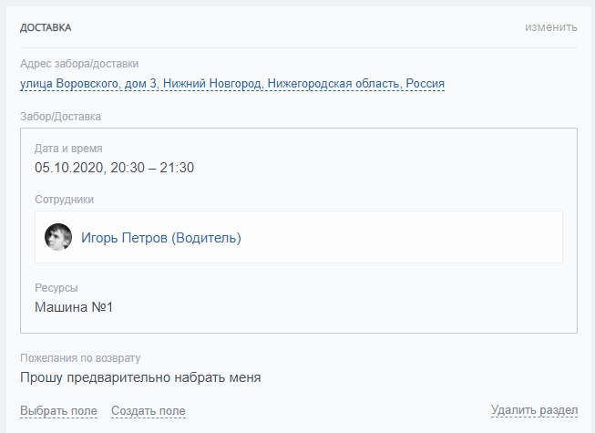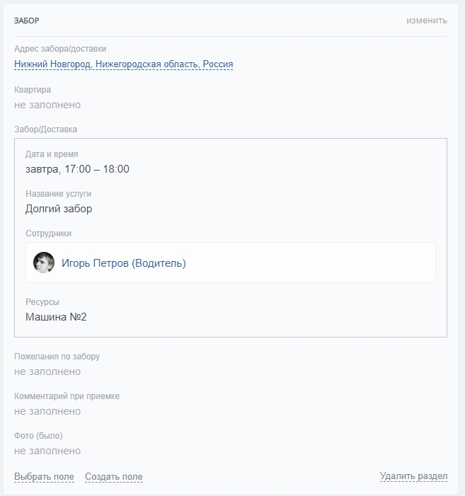 - Приемка/Забор - ставится задача для водителя на осуществление забора с указанием адреса забора, меняется ответственный за сделку на водителя. Также возможна интеграция с логистическими сервисами для прокладки эффективных маршрутов и контроля перемещения водителей на карте. Для подключения данной опции обратитесь к нам, и мы это сделаем бесплатно!