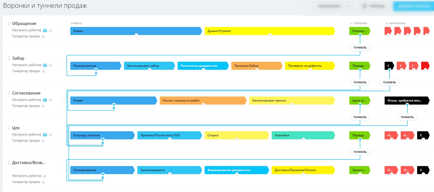 - Ведение клиента в 5-ти воронках, с разбивкой на этапы обслуживания.