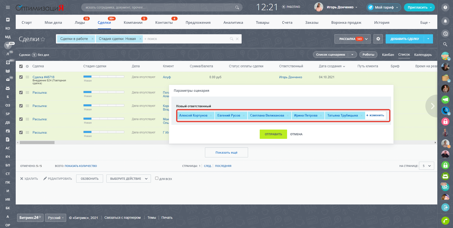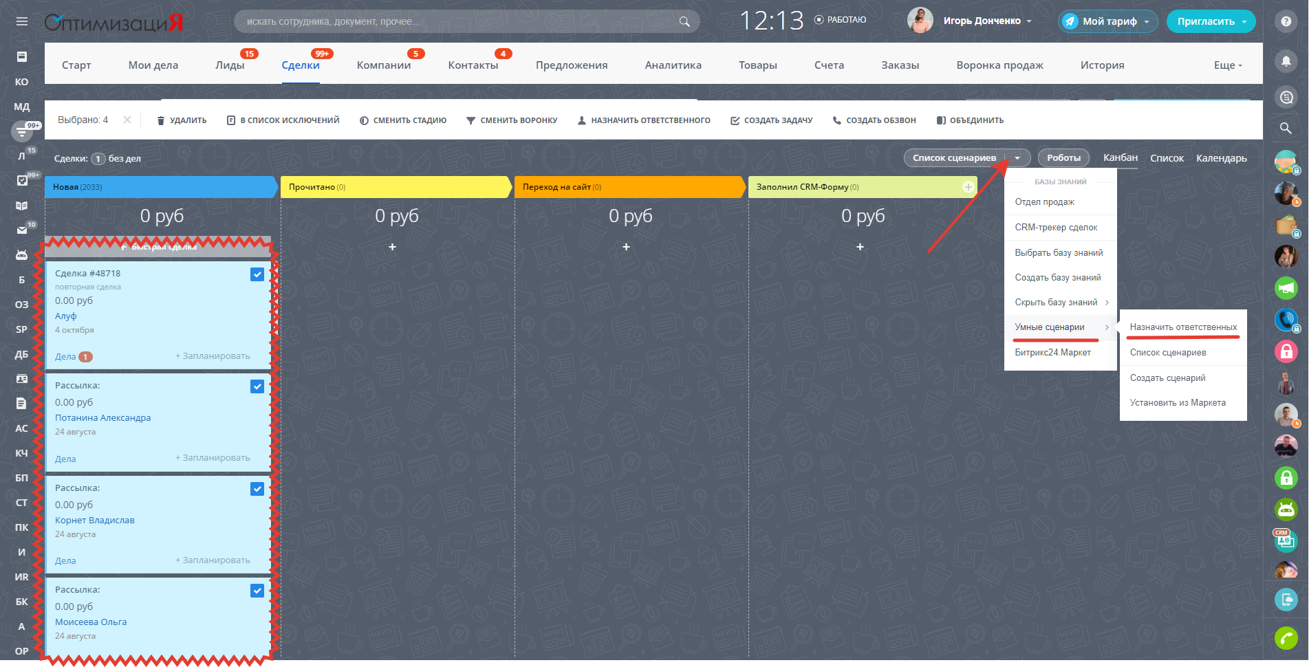 - Автоматизация равномерно устанавливает новых ответственных за сделку, контакт и компанию (привязанных к данной сделке).