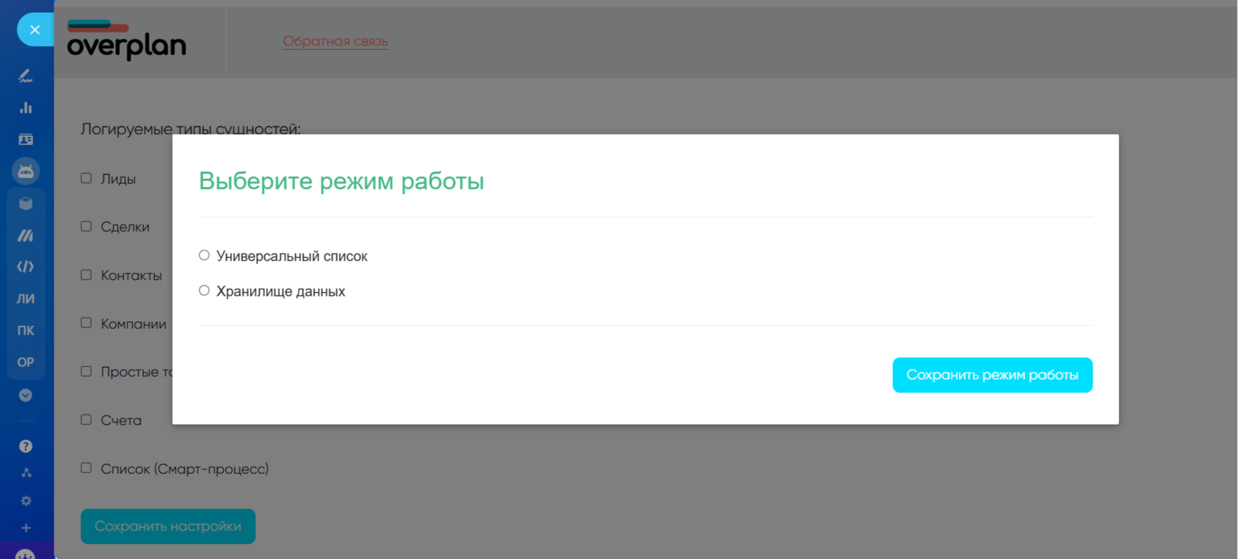 В приложении доступно два типа хранения информации: в Универсальных списках (приложение самостоятельно создает новый одноименный список, если списки доступны на Вашем тарифе) или в Хранилище приложения. Для изменения данного выбора необходимо переустановить приложение.