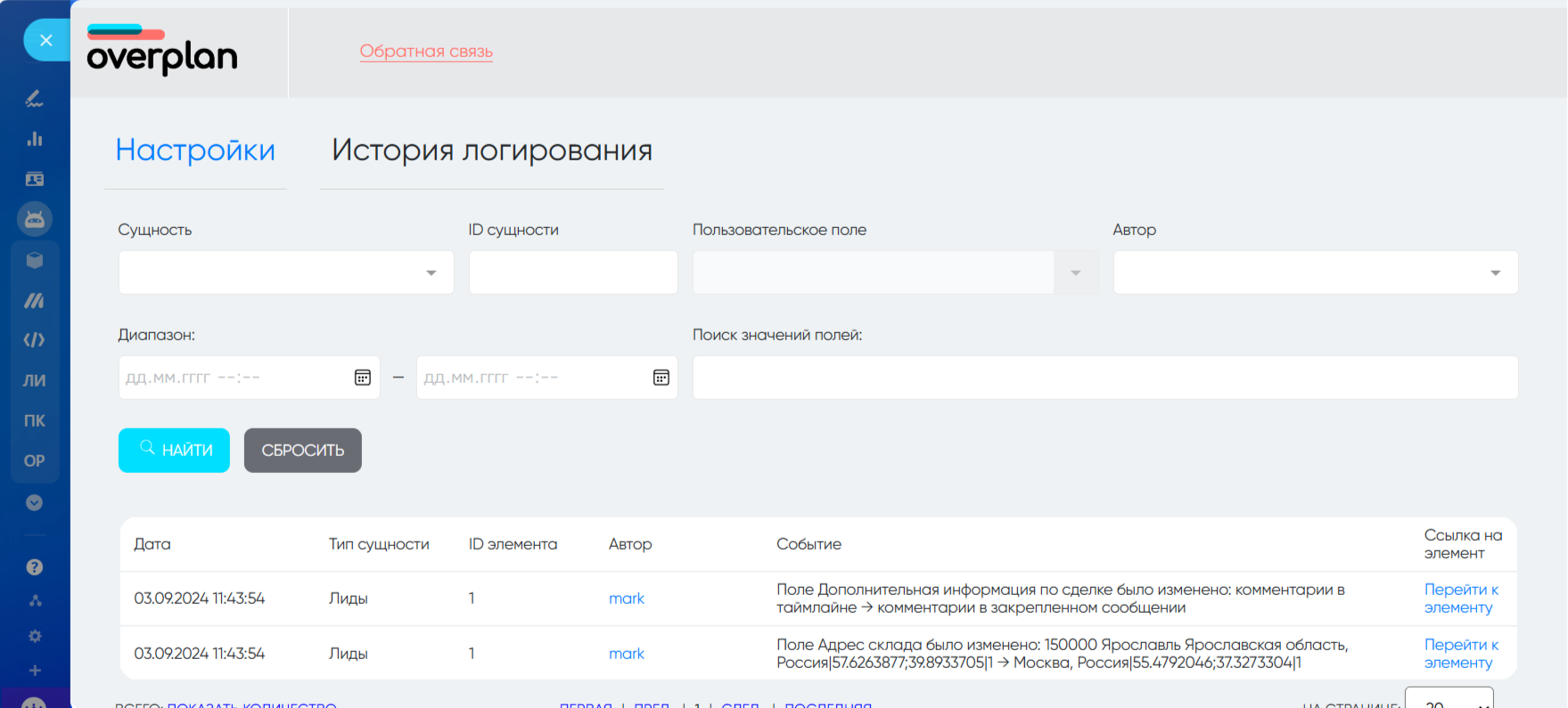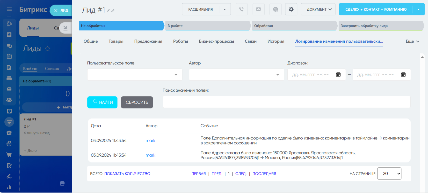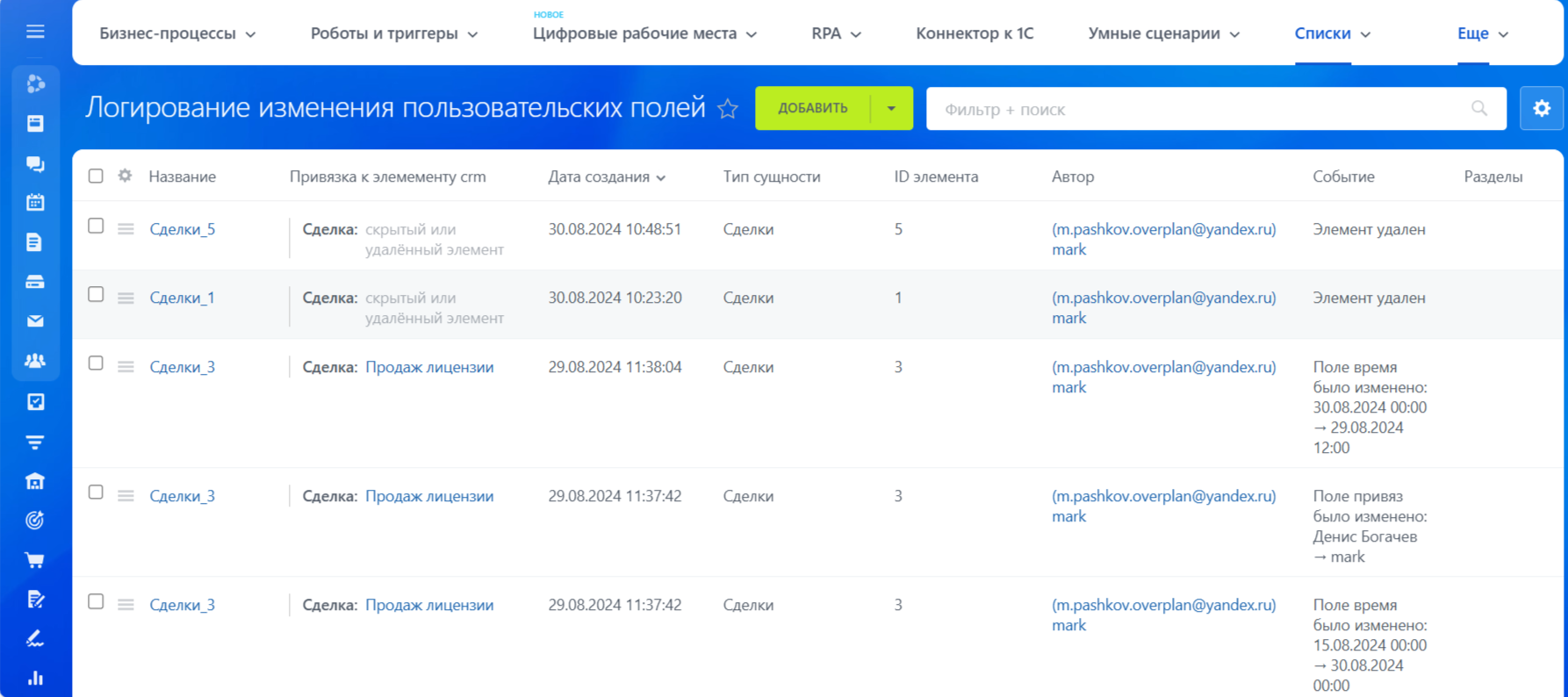 Приложение "Логирование изменения пользовательских полей" позволяет логировать все изменения выбранных Вами пользовательских полей в сущностях: Лид, Сделка, Контакт, Компания, Счета, Смарт-процессы, Услуги и Простые товары без вариаций.