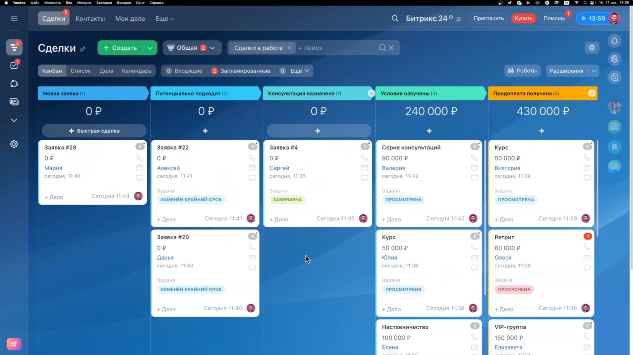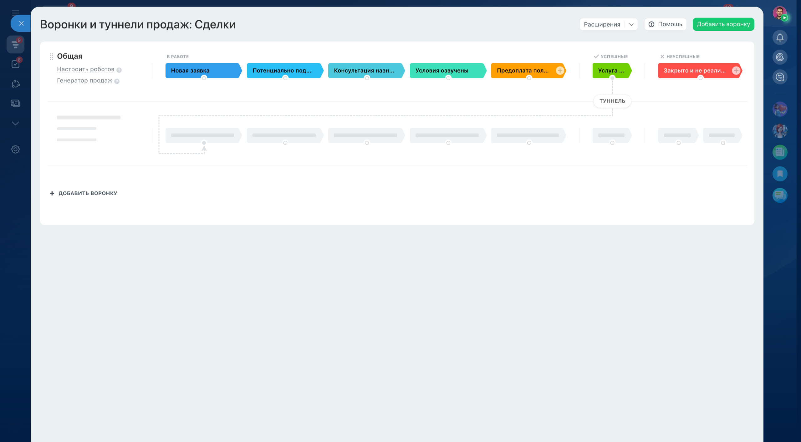 • Воронка из 6 этапов — точно под ваш цикл работы с клиентом,