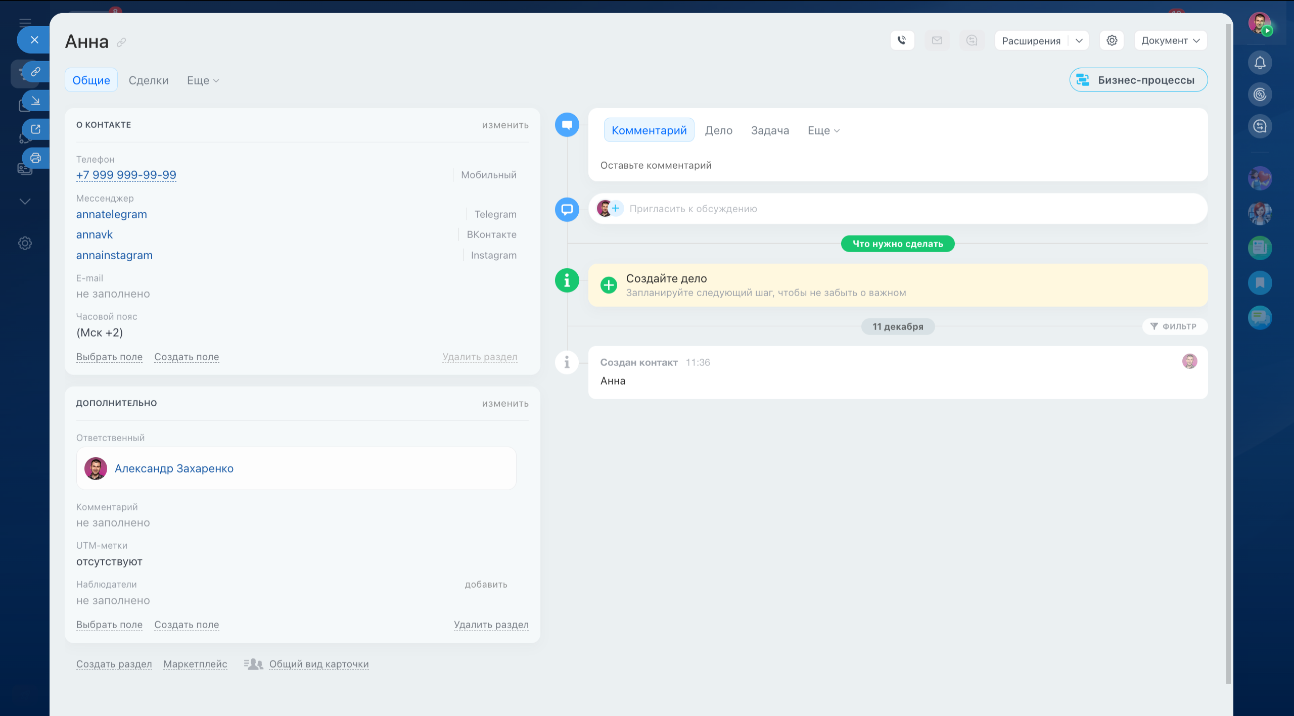 В карточке контакта добавлено пользовательское поле "Часовой пояс".