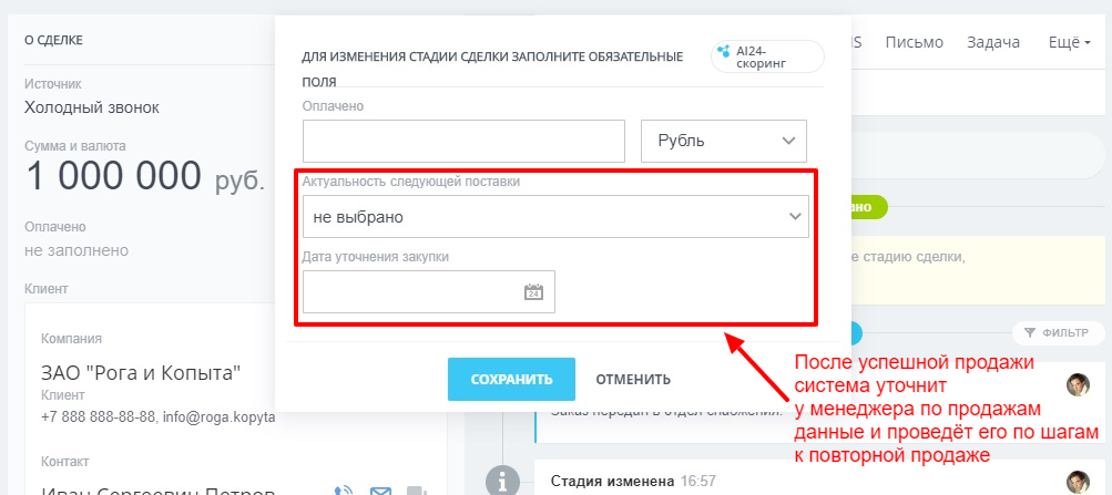 После успешной продажи система уточнит у менеджера по продажам данные, чтобы провести его по шагам к повторной продаже